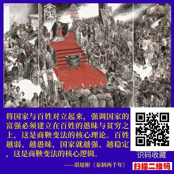 将国家与百姓对立起来,强调国家的富强必须建立在百姓的愚昧与贫穷之上,这是商鞅变法的核心理论。百姓越弱、越愚昧,国家就越强、越稳定,这是商鞅变法的核心逻辑。对此,《商君书》中有大量的陈述和解释。试举几例: