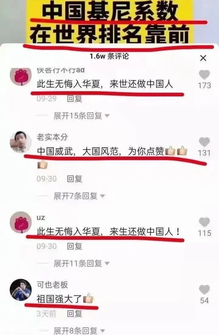 基尼系数排名靠前,这是需要正视的问题。但有些人不是这样想的,一看到标题有“排名靠前”四个字,连内容都不用看,就开始兴奋了,“中国威武,大国风范,为你点赞”、“祖国强大了”等等,又自豪又骄傲。这些人是低级红吗?不是。是高级黑吗?其实也不是。他们还不具备低级红和高级黑的智商。他们只是无知无脑而已。在看到“排名靠前”四个字时,便如条件反射般的开始兴奋,莫名其妙的开始自豪。