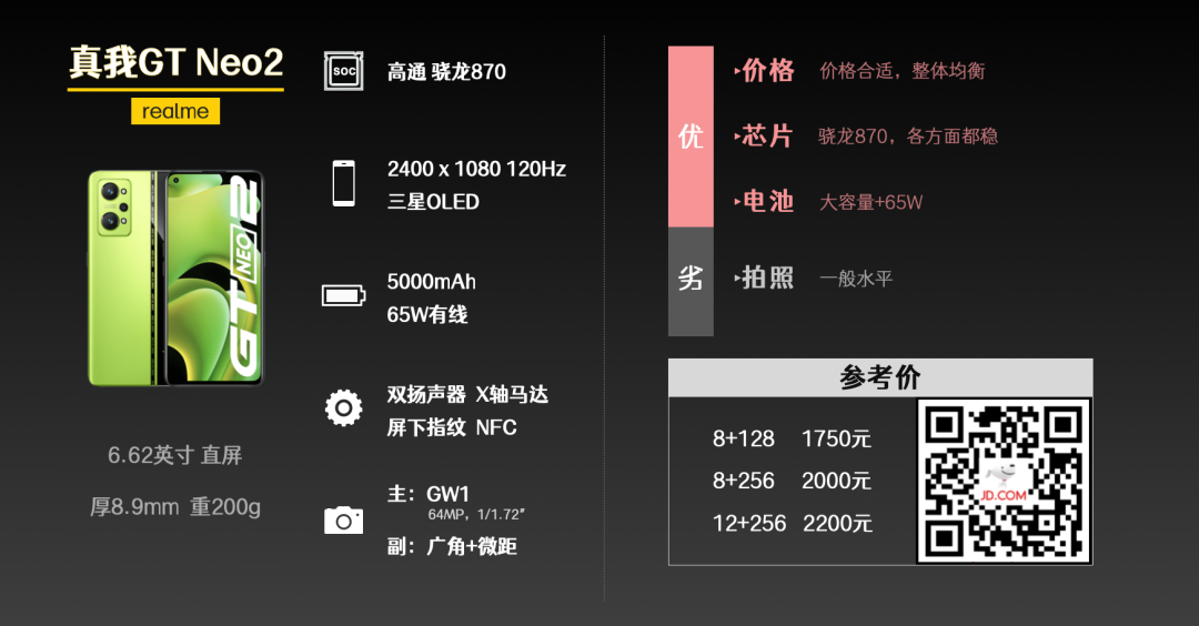 就比如真我GT Neo2,价格差不多,有X轴马达,NFC,三星OLED屏幕,电池规格也要高不少。
