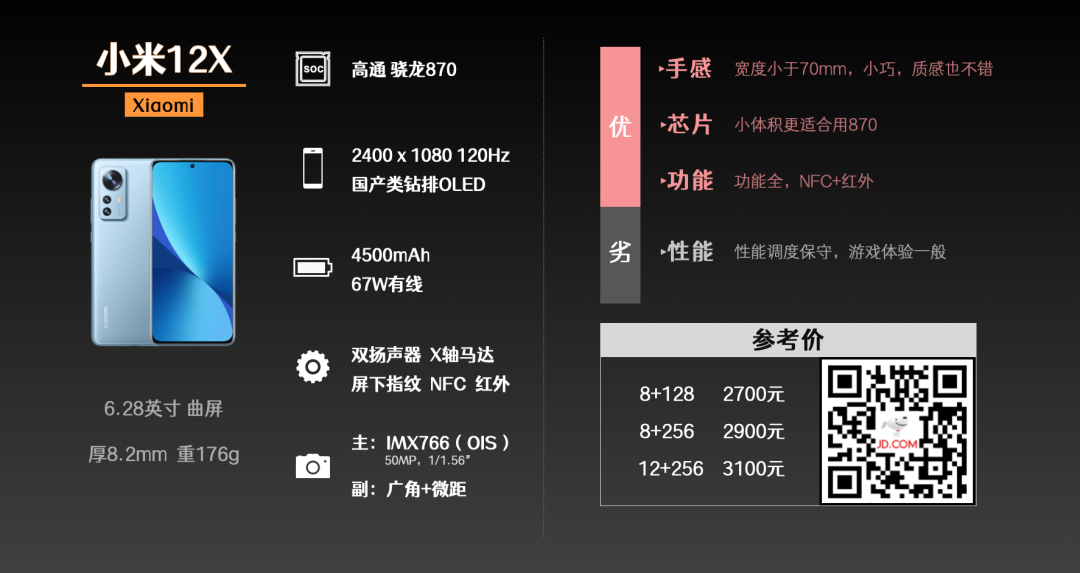 小米12X相较于首发价也降了好几百了,主要特色是小体积,在如今普遍6.5英寸以上屏幕的手机里,小米12X已经算是挺小的了。