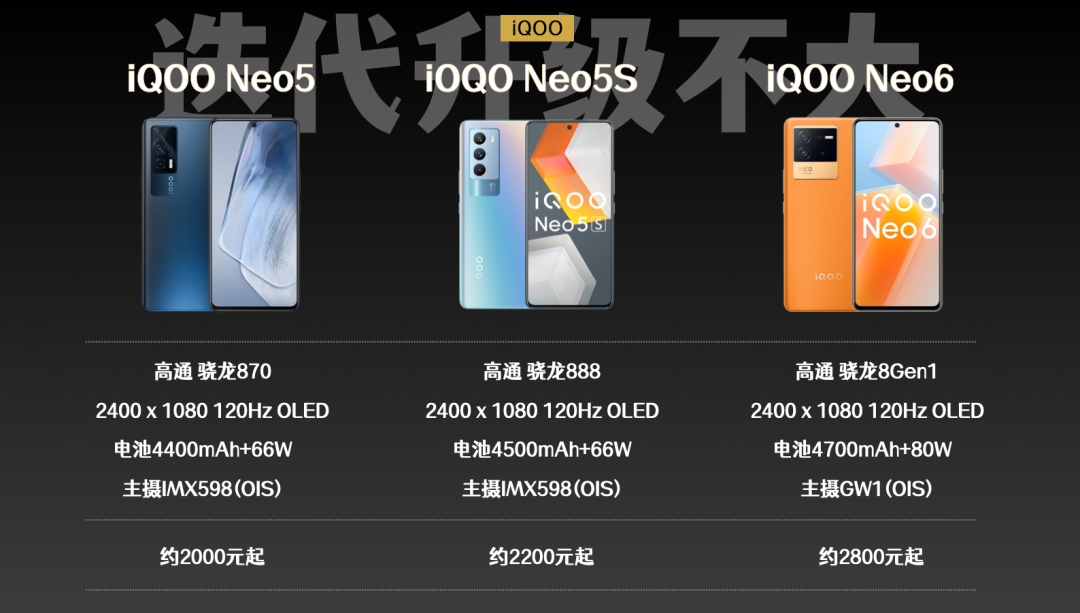 还有就是它有俩迭代,Neo5s和Neo6,最大的区别就是芯片换成了888和8Gen1,这俩芯片实在是没法给人购买的欲望……Neo5s要是价格差不多的话可以考虑,Neo6的升级稍多点,但是价格贵太多了,个人觉得现在不值得买。