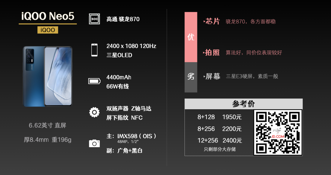 iQOO Neo5和前面提到的活力版之类的完全不同,是OLED屏幕,并且优势是拍照,从去年至今一直都是很不错的870产品。