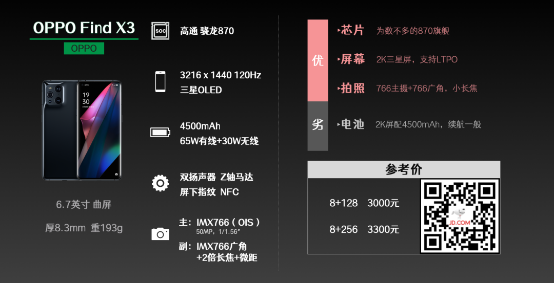 Find X3是少有的870旗舰,各方面规格都挺高,2K屏,双766主摄,无线充之类的都有,这个外观能不能接受见仁见智吧。