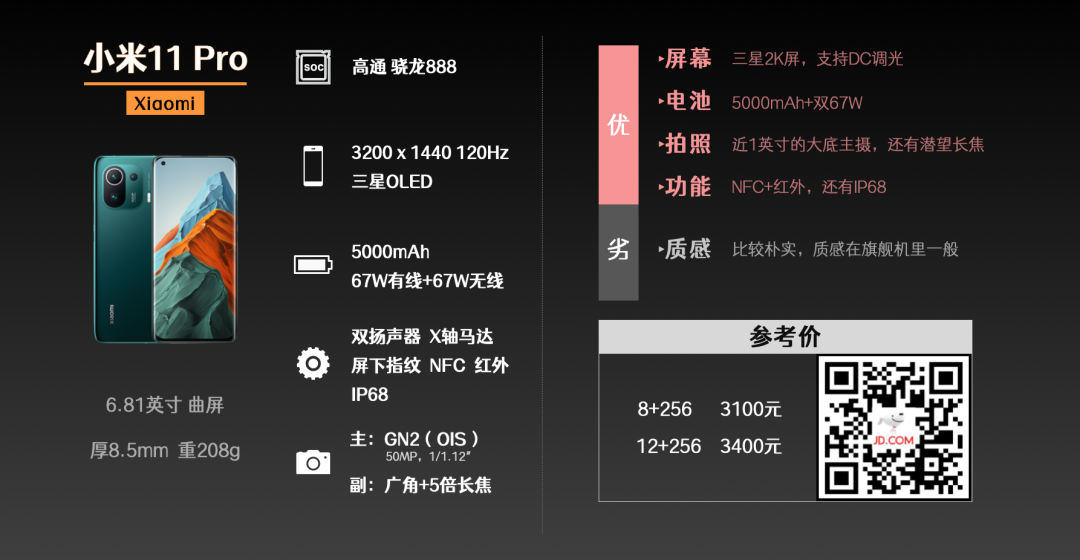 小米11Pro是一款很实用的旗舰,配置堆料很足,2K屏,超大底主摄,潜望长焦还有IP68等等旗舰配置都有,电池规格也很高,现在已经优惠到了3000元左右,是现阶段性价比非常高的老旗舰,配置也完全不输新旗舰。