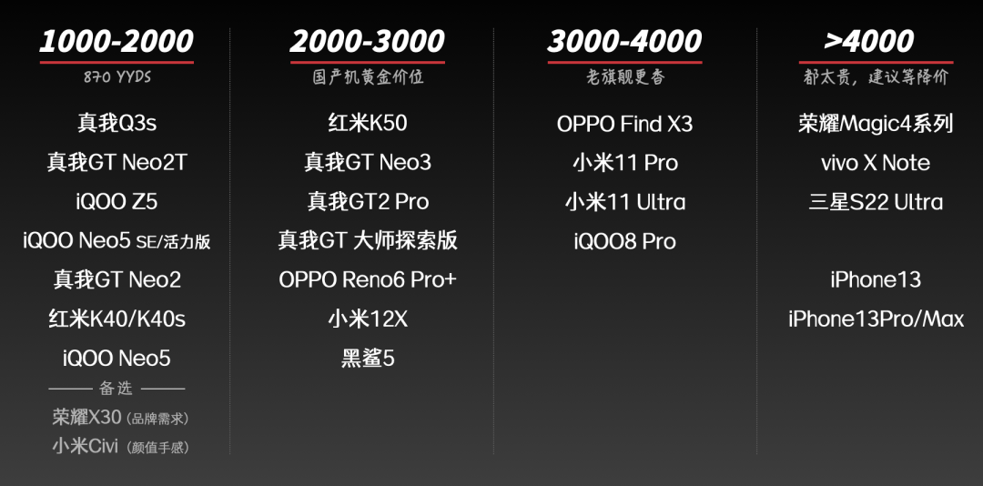 到了这个价位,情况比较复杂了。新机有前一阵热门的红米K50和真我GT Neo3,都是很有竞争力的新鲜血液,同时一些老产品也依然很香。并且这个价位就能买到各方面都比较均衡的产品了。