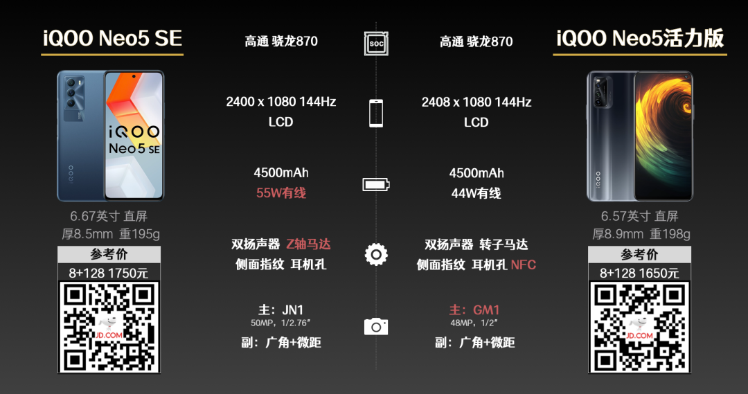 说两款优先级没那么高的,都是用了LCD屏幕,比较便宜的870产品,iQOO Neo5 se和活力版。