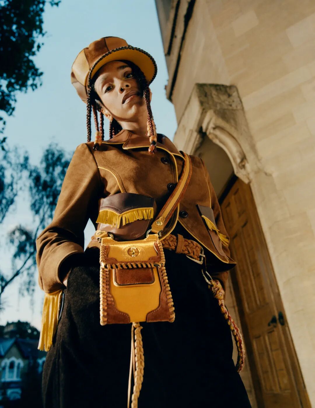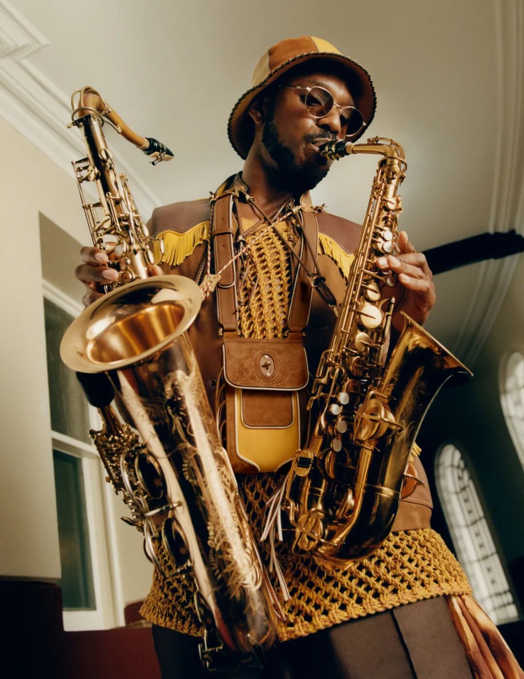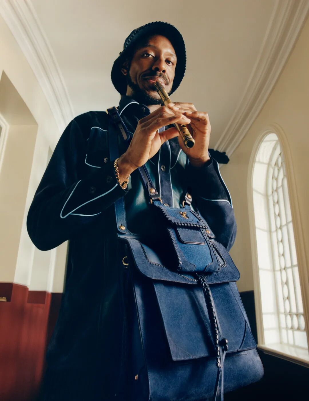 ND:就拿这个合作系列来说,里面有很多知识的传承,而这样的教诲一直存在于产业内。此前已经有两代设计师在为后继者铺路了,比如第一批在巴黎办秀的英国黑人设计师——Joe Casey-Hayford。在与Mulberry合作中,萨克斯风乐手Shabaka Hutchings就教导了Tomorrow’s Warriors的号手等下一代有天赋的音乐人,这样非物质的传统和知识的传承很重要。物件的传承也很重要,比如皮具。我很喜欢这个系列里可以长期使用的皮具,使用中时间的痕迹反而体现了它们跨越时间的存续。与Mulberry的合作系列很好地通过皮具交融了古今。我相信你也体验过延续来自中古店或者爸妈衣橱的皮包或皮衣的生命。乐器也是如此。Shabaka也许可以把他的萨克斯风带或者包传给他的孩子。皮具作为人类文明历史中最古老的独特面料之一,有着持久耐用的特点,让皮质产品可以供几代人使用。Mulberry的工厂正在进一步发展维修服务。人们越来越少地扔掉旧东西,因为正是使用的痕迹让每件皮具有了自己特点。这个关于社群、文化和工艺的合作系列考虑到了未来(永续性),用皮具糅合了我想做的事情。皮具拼贴也许是二十一世纪最好的呈现英国文化和英国性的方式。Mulberry所有的生产力都是为了文化呈现服务,比如这个帽子。