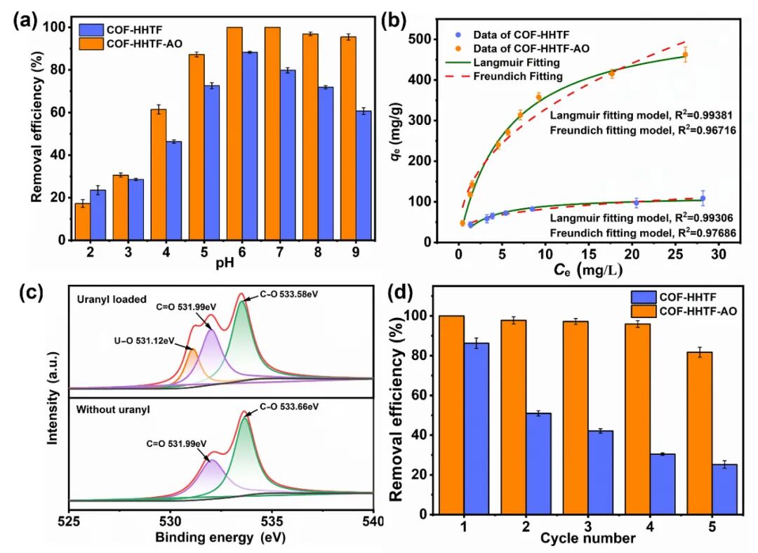 Fig. 3 Uranium adsorption experiments in aqueous solution and binding mechanism investigation. (a) Effect of pH on the uranium adsorption efficiency and (b) Uranium sorption isotherms for COF-HHTF and COF-HHTF-AO. (c) High-resolution XPS spectra of O 1s for COF-HHTF-AO before and after the uranium extraction. (d) The uranium adsorption efficiency of COF-HHTF and COF-HHTF-AO in five successive reusing cycles. The error bars indicate standard deviations in three replicates.