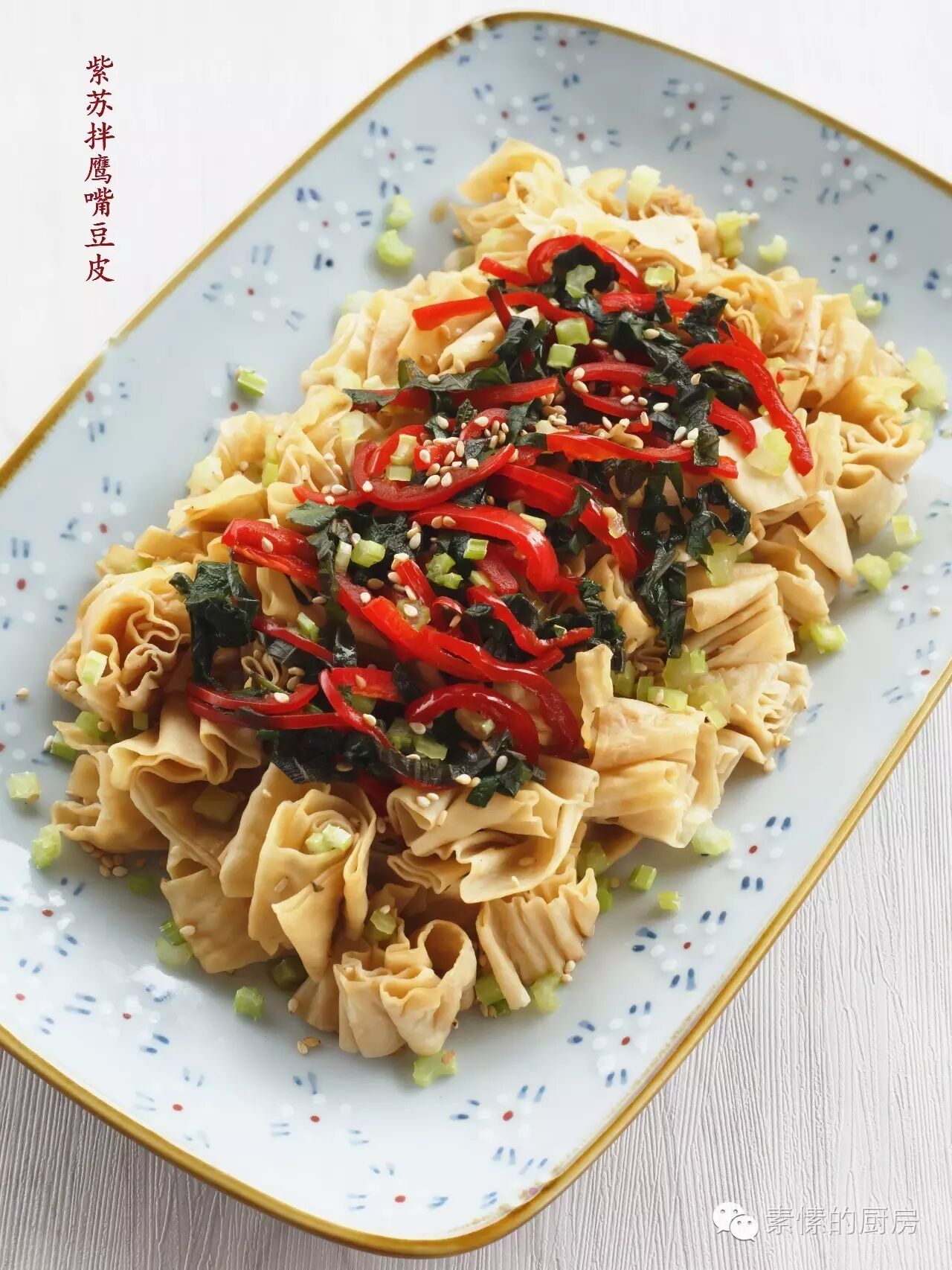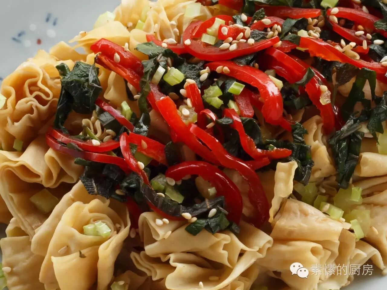 9.腌好的红椒紫苏和酱汁一起倒在豆皮上。撒上芹菜粒和芝麻粒。