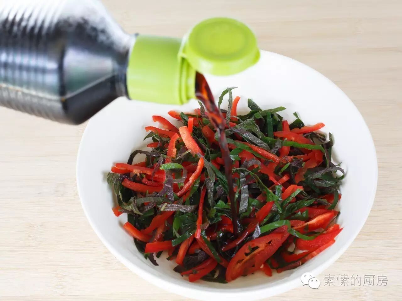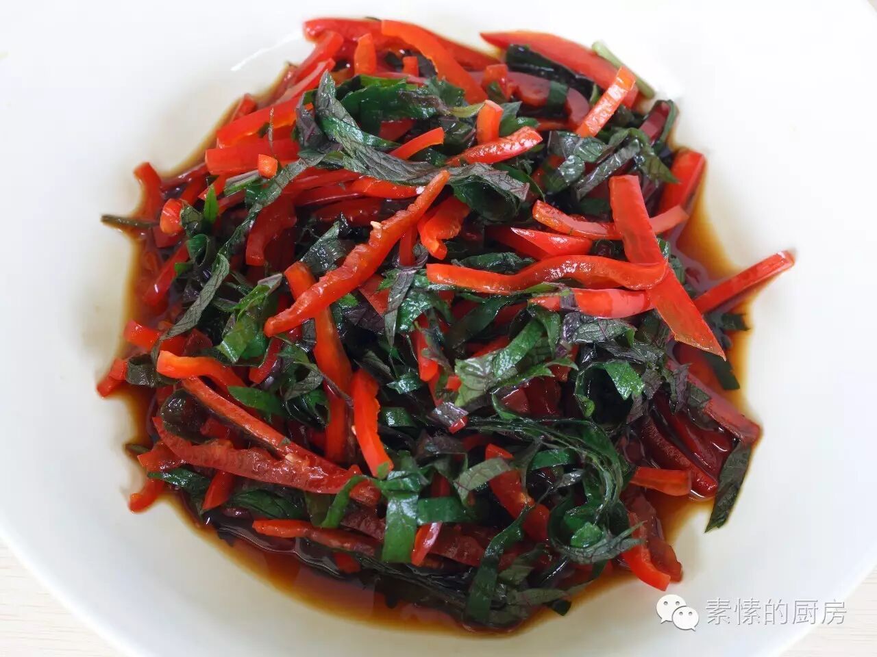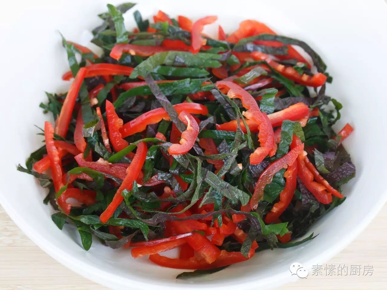 3. 多张叶子相叠,切成细条,和红椒丝放一起。
