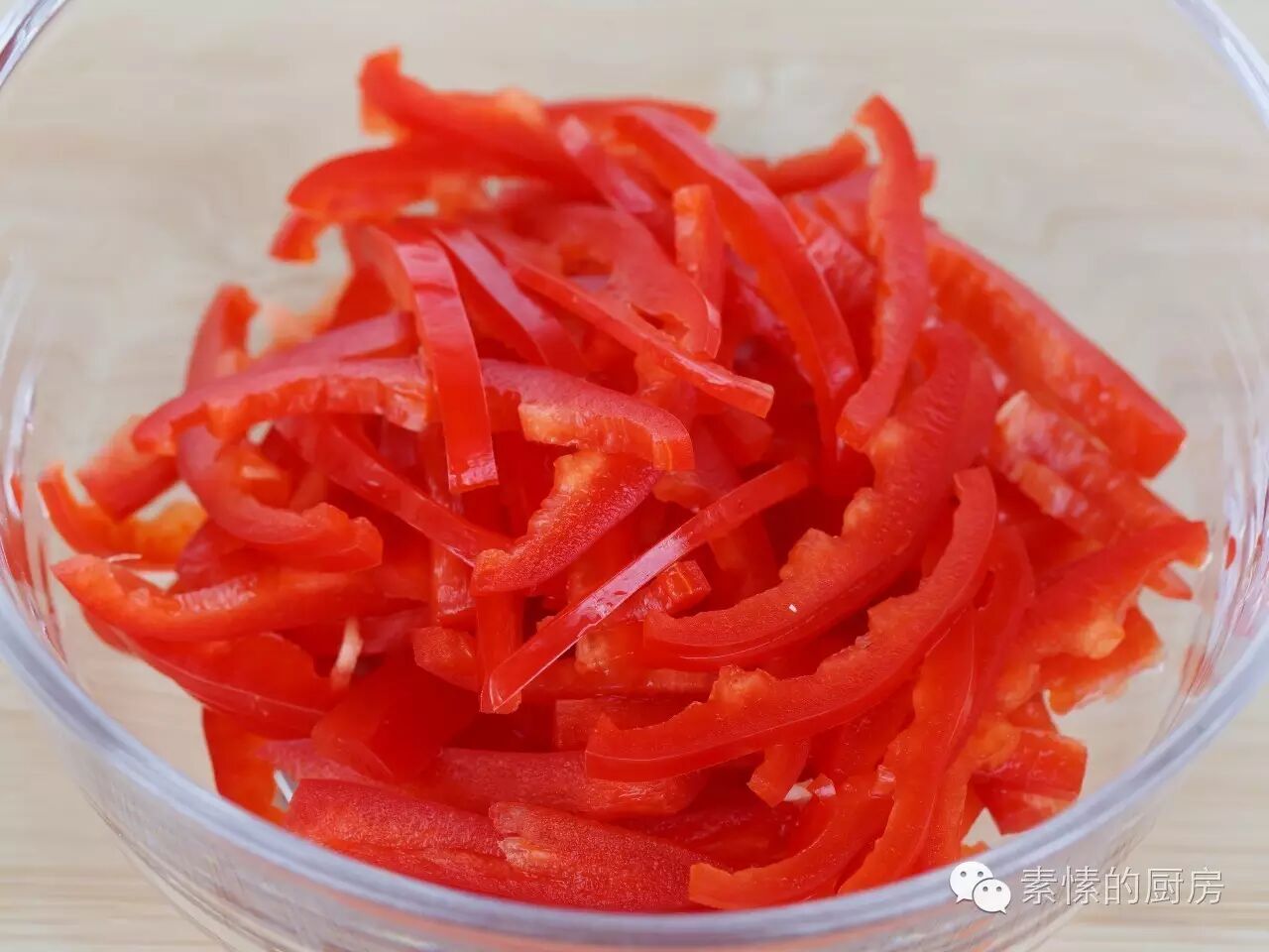 1.红椒洗净去蒂,纵向对半切开去籽,横向切成很细的丝。