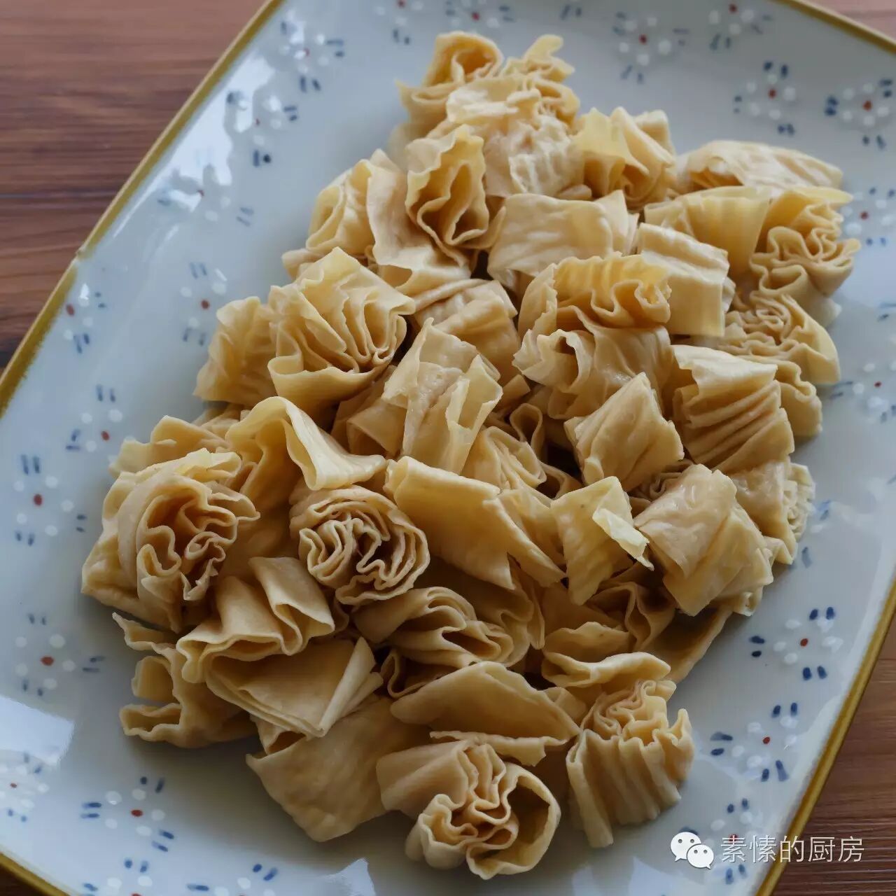 6. 鹰嘴豆皮用常温好水浸泡数分钟,捞起轻捏挤去水分,放在盘里。喜欢口感软些泡久点,或用热水泡。