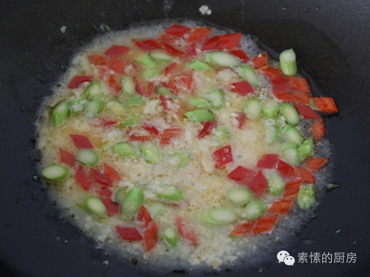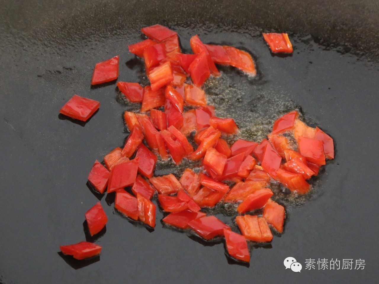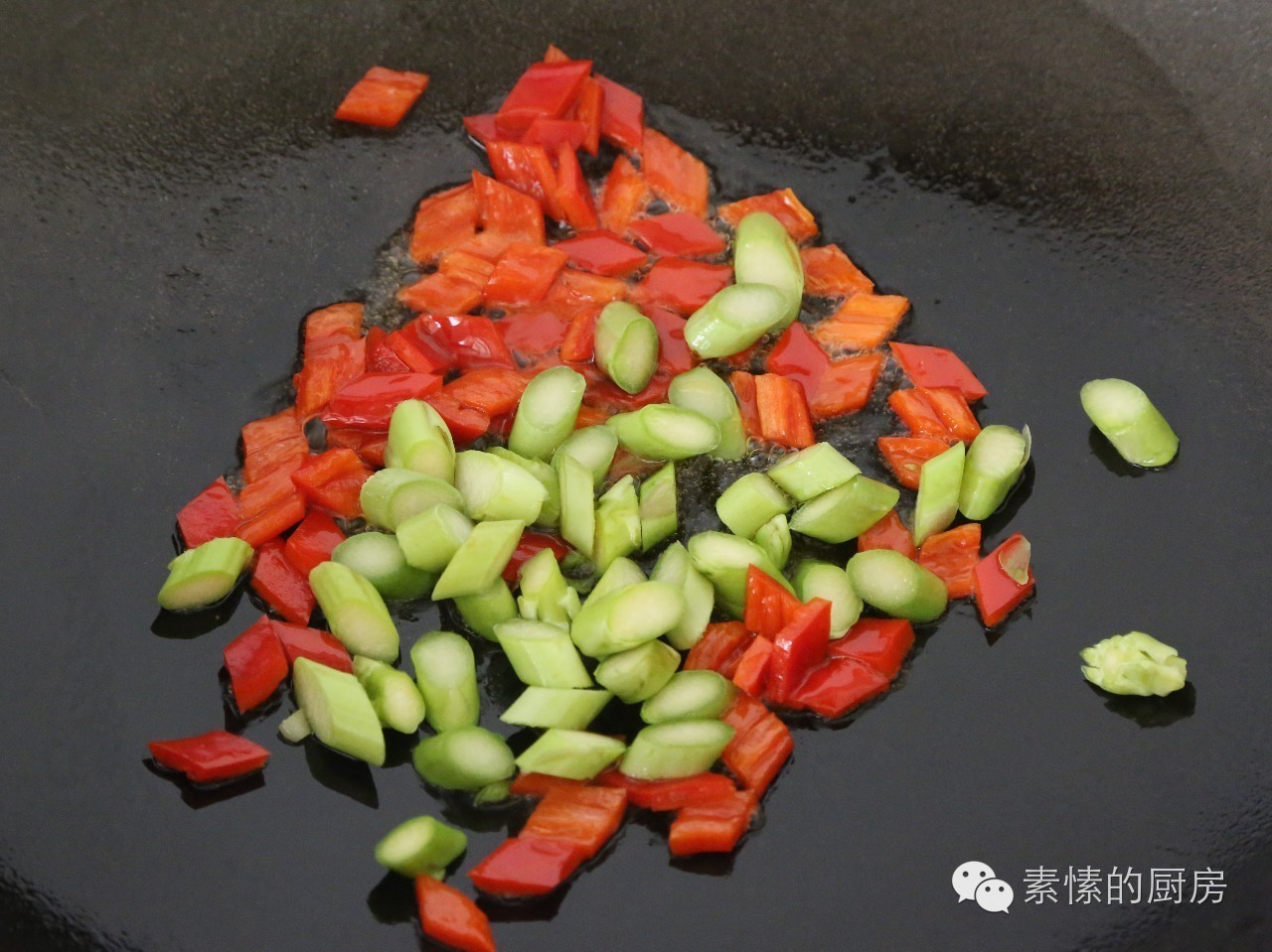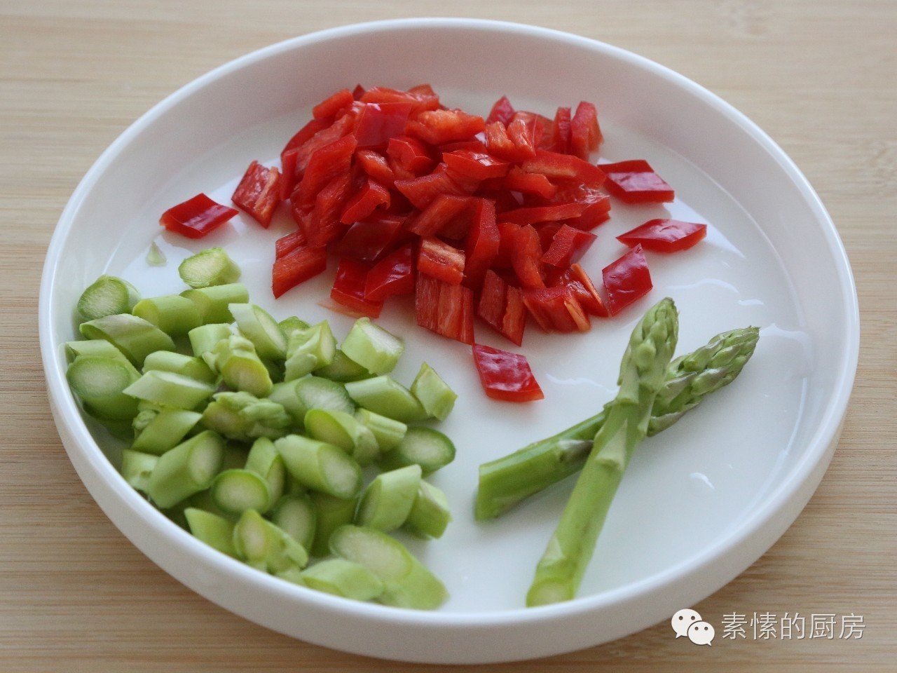 3. 红椒去蒂,纵向对半切开去籽,切成长条,再斜切成菱形。芦笋去掉根部老的部分,切两段顶部留作装饰,用开水淖熟。其他斜切成小段。