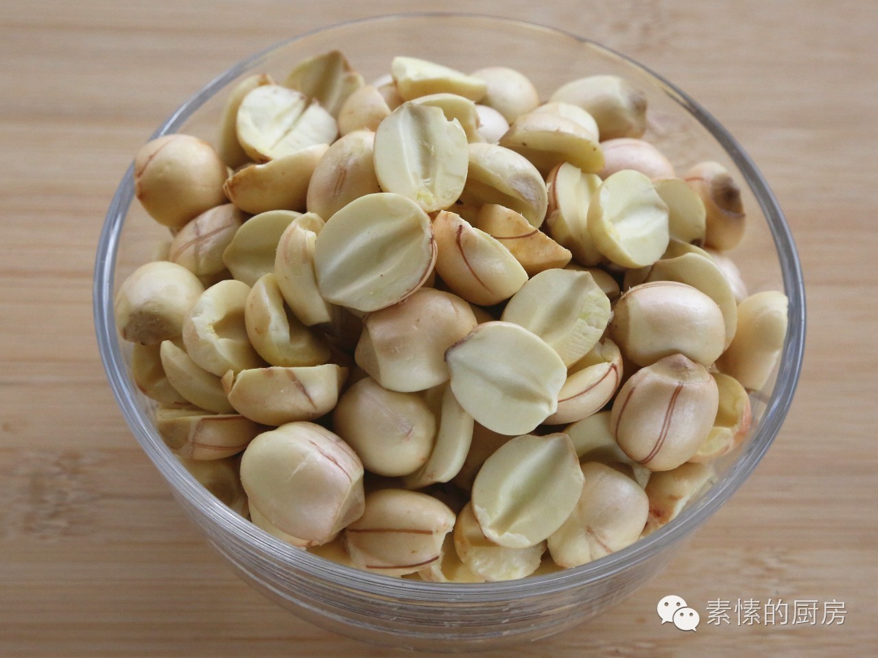 1.新鲜莲子对半剖开,取出莲芯,撕去外皮。干莲子省去这步。