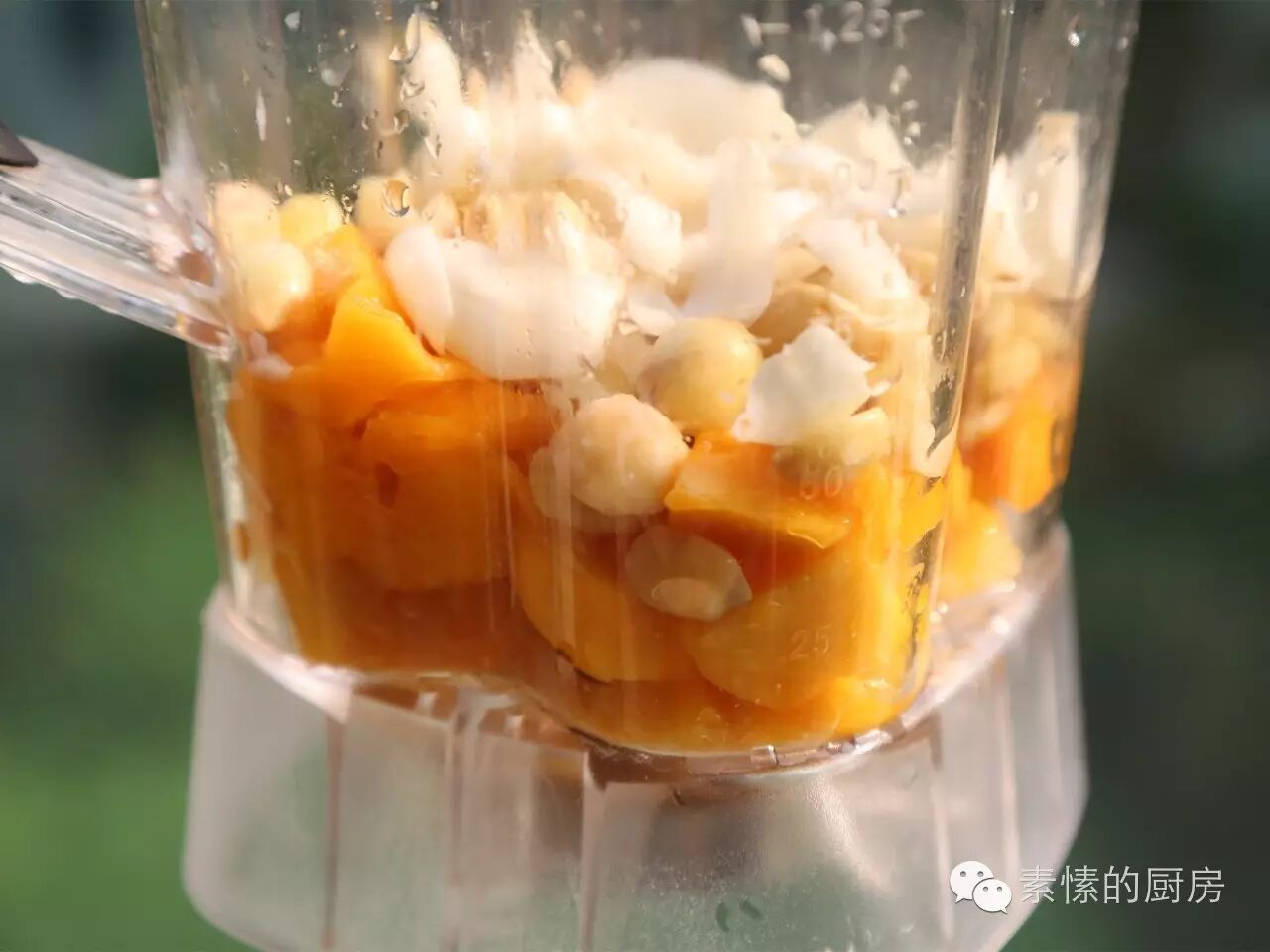 6. 用刀将芒果肉刮入调理机中,加入一些百合,一些蒸熟的莲子,少许好水,打数十秒至顺滑,可再添加适量的水,调整至满意的稠度。