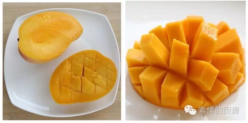 5. 芒果贴着核切开,在果肉上划出交叉线,将果肉往上顶出。
