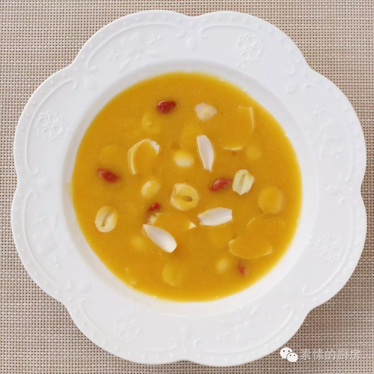 7. 将余下的莲子,百合,枸杞平铺于盘,倒入打好的芒果羹,若隐若现中,撩动着人的食欲。