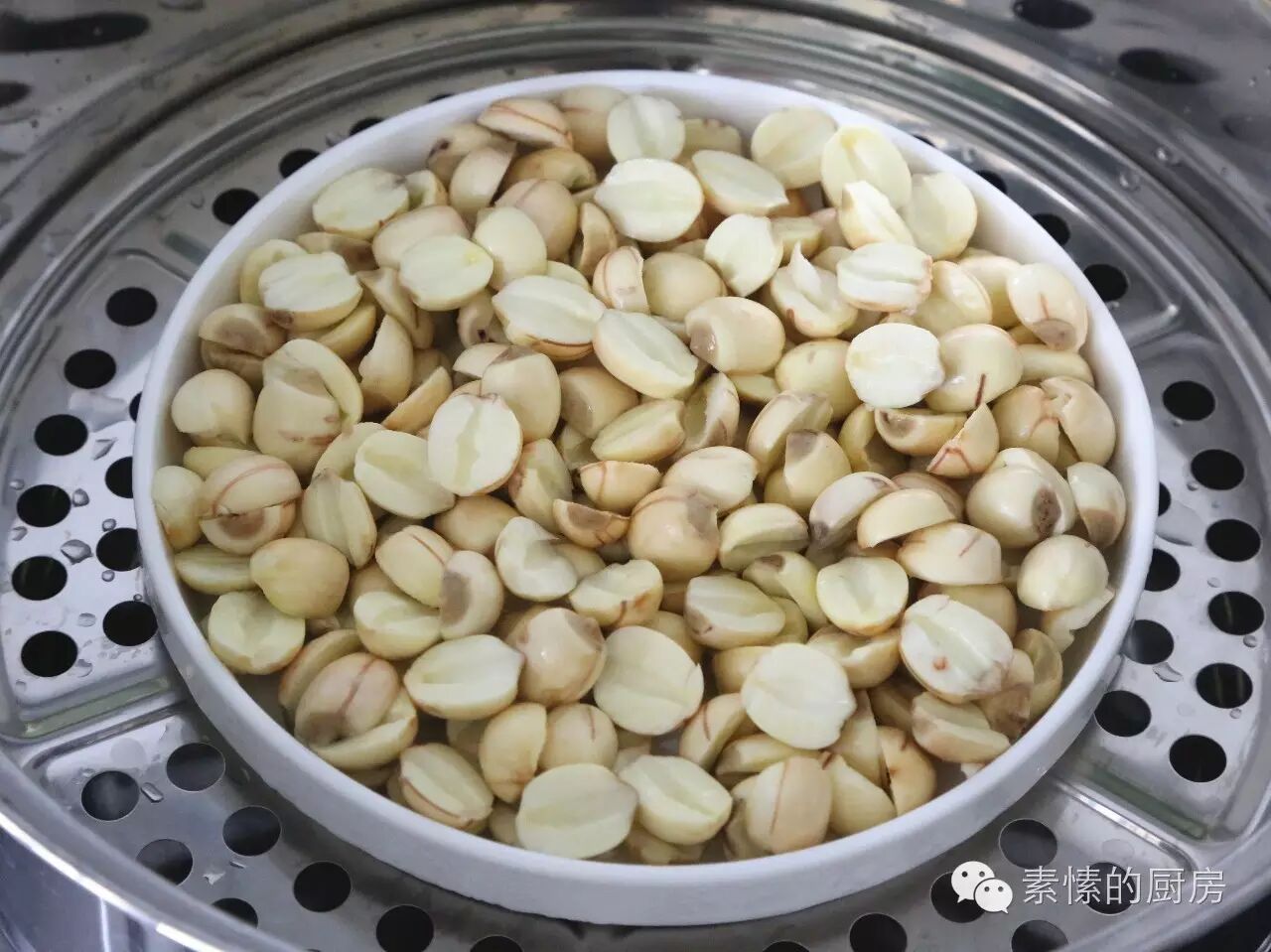 2.烧开水,入锅蒸熟,约需15分钟。干莲子则用电饭锅或高压锅煮熟。