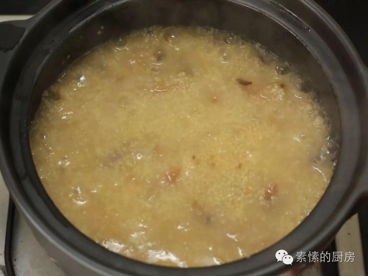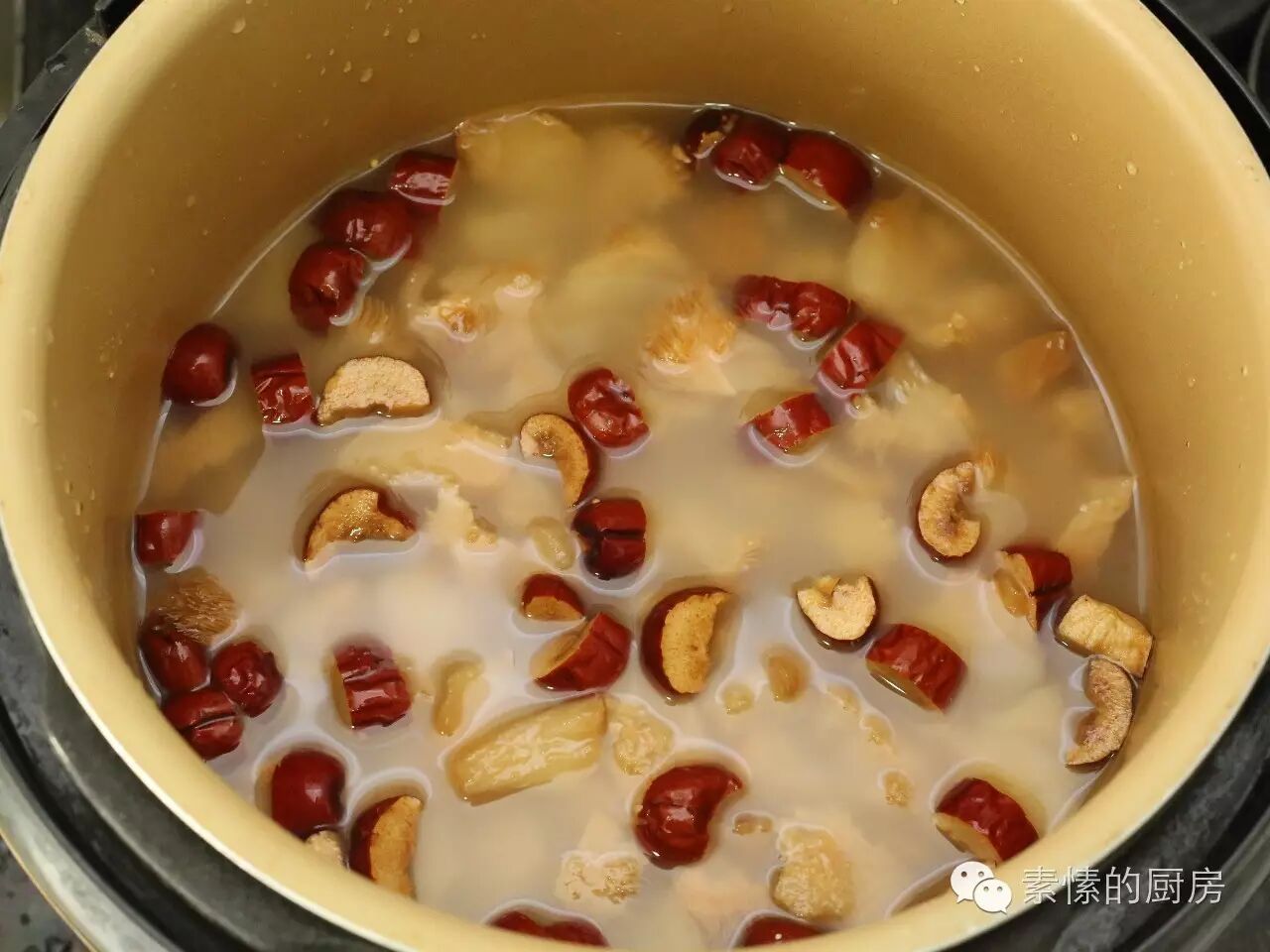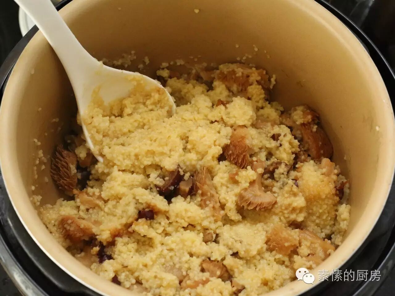 4. 小米淘洗放入电饭锅,加入枣,猴头菇,适量好水,煮粥。把握不准水量可以少放,下一步再加水煮。