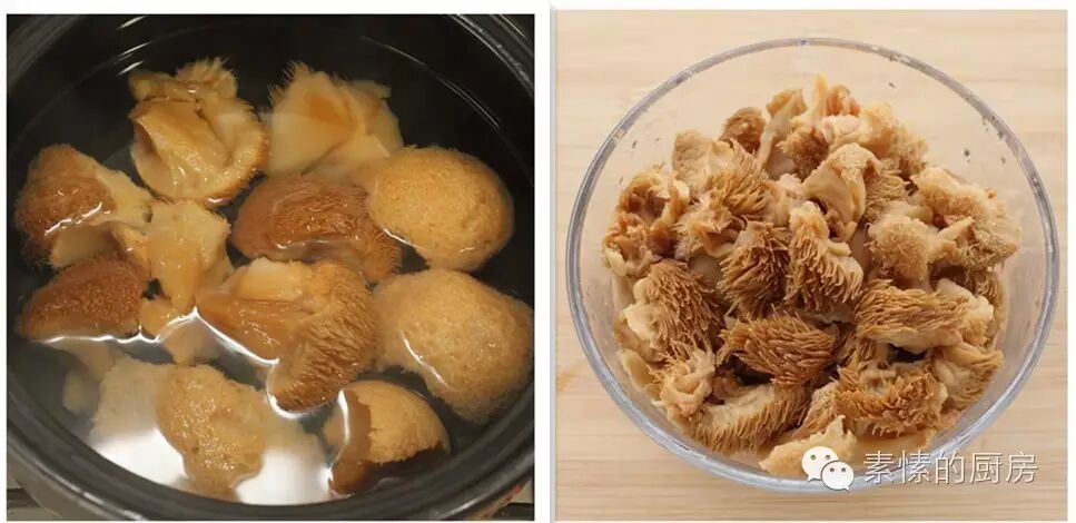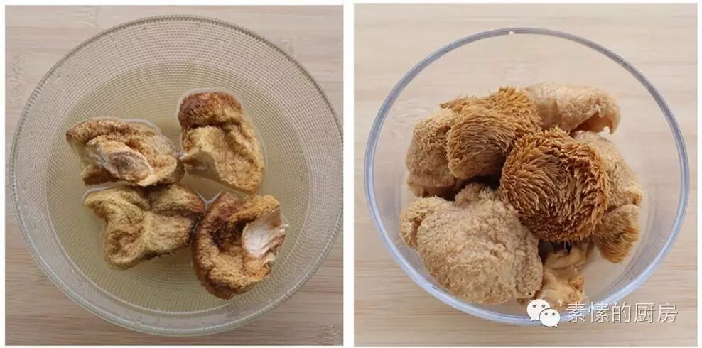 1. 干猴头菇掰开几块,好水浸泡半天,清洗至水清,如有较老根部切去。