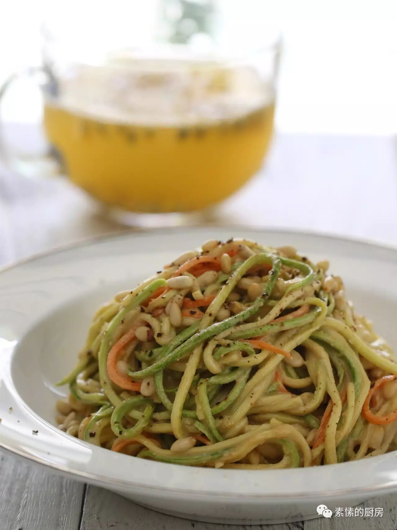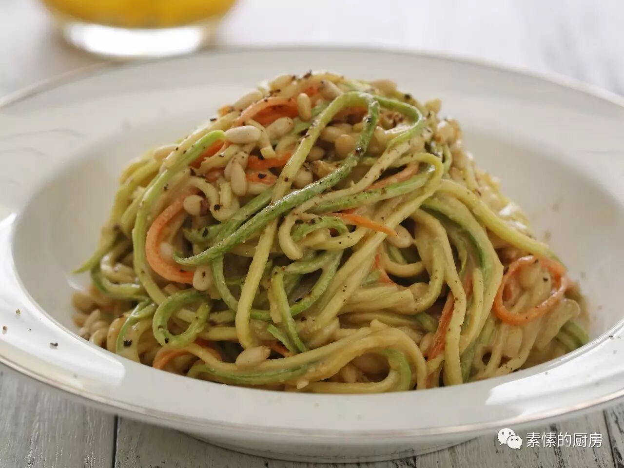 5. 把面条移到一个盘里,撒一把松子(或白芝麻),磨些黑胡椒。
