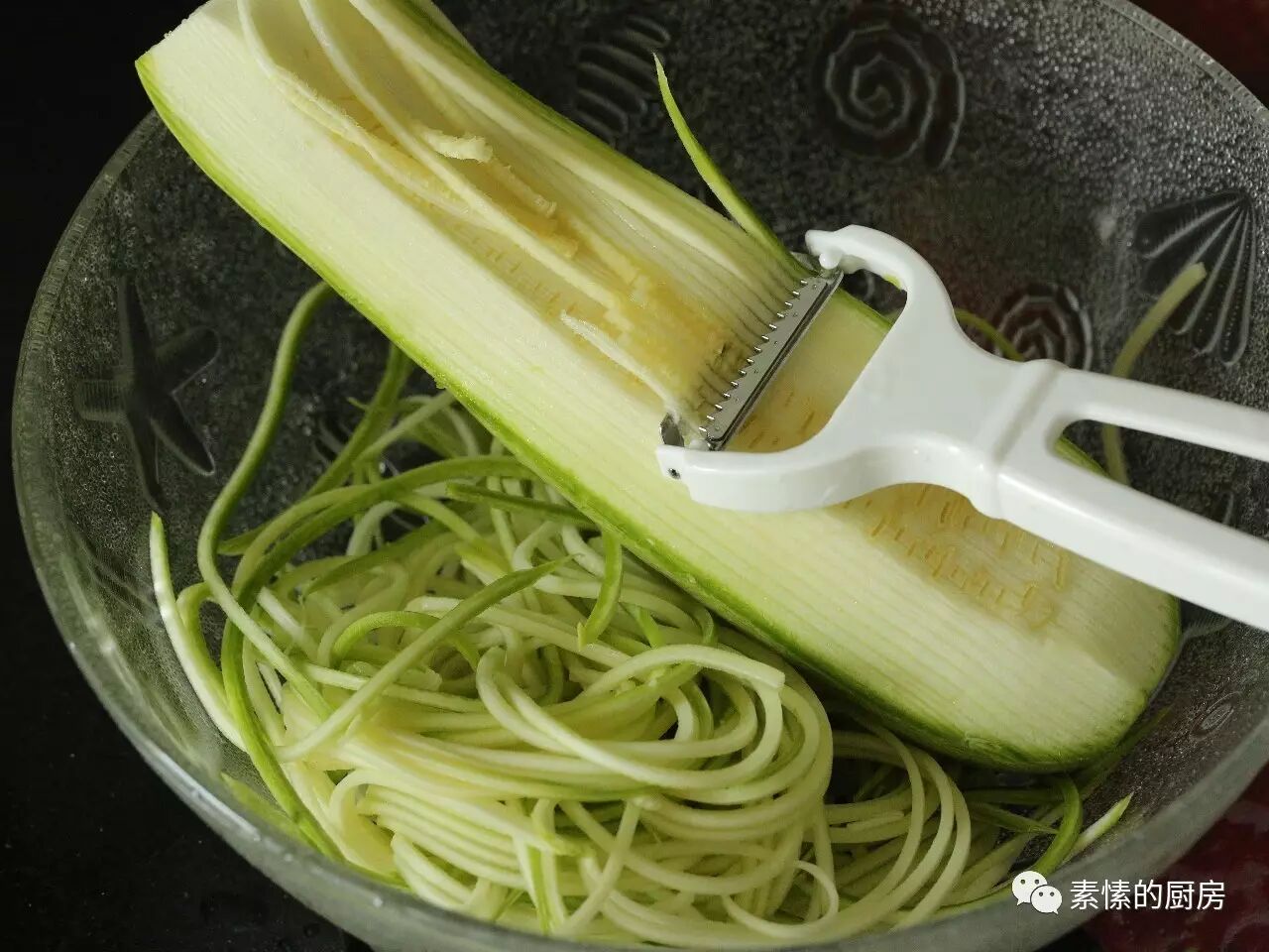 1.西葫芦用环保酵素浸泡洗净。去头尾,用刨丝的家伙,弄成细长条状。余下不好刨的,可以用刀,叫刀切面。