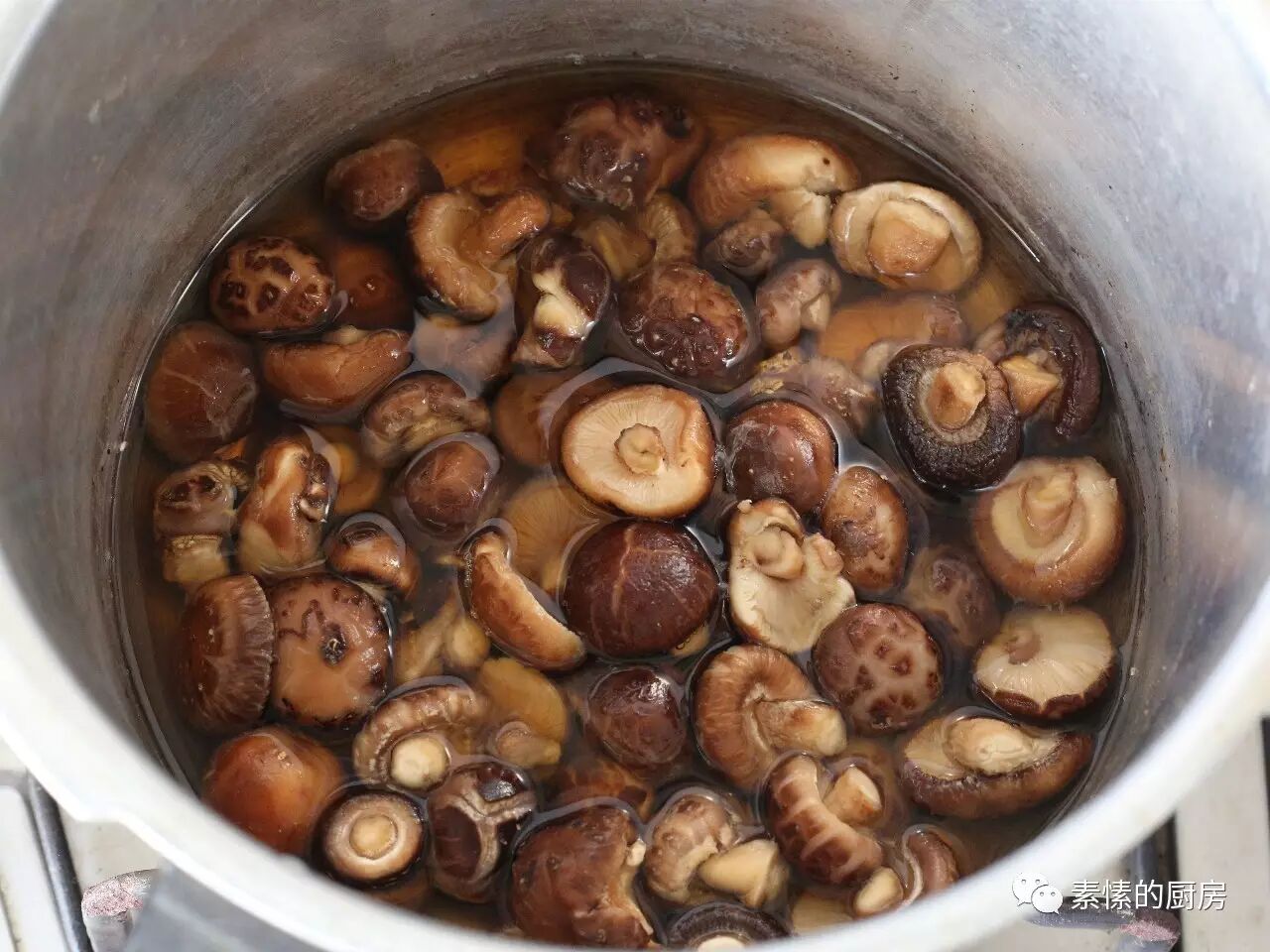 3. 小花菇用好水浸泡开,去除根部杂质,洗净。将泡菇的水(底部杂质不要)和菇放入锅中,水少可适量添加,没过菇即可。