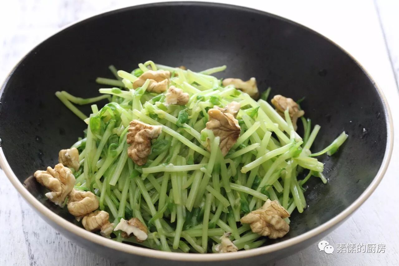 3. 同时,将豆苗用开水快速焯熟(想更入味可以在水里加盐),捞出放在碗中,将余下的核桃稍掰碎,撒入。