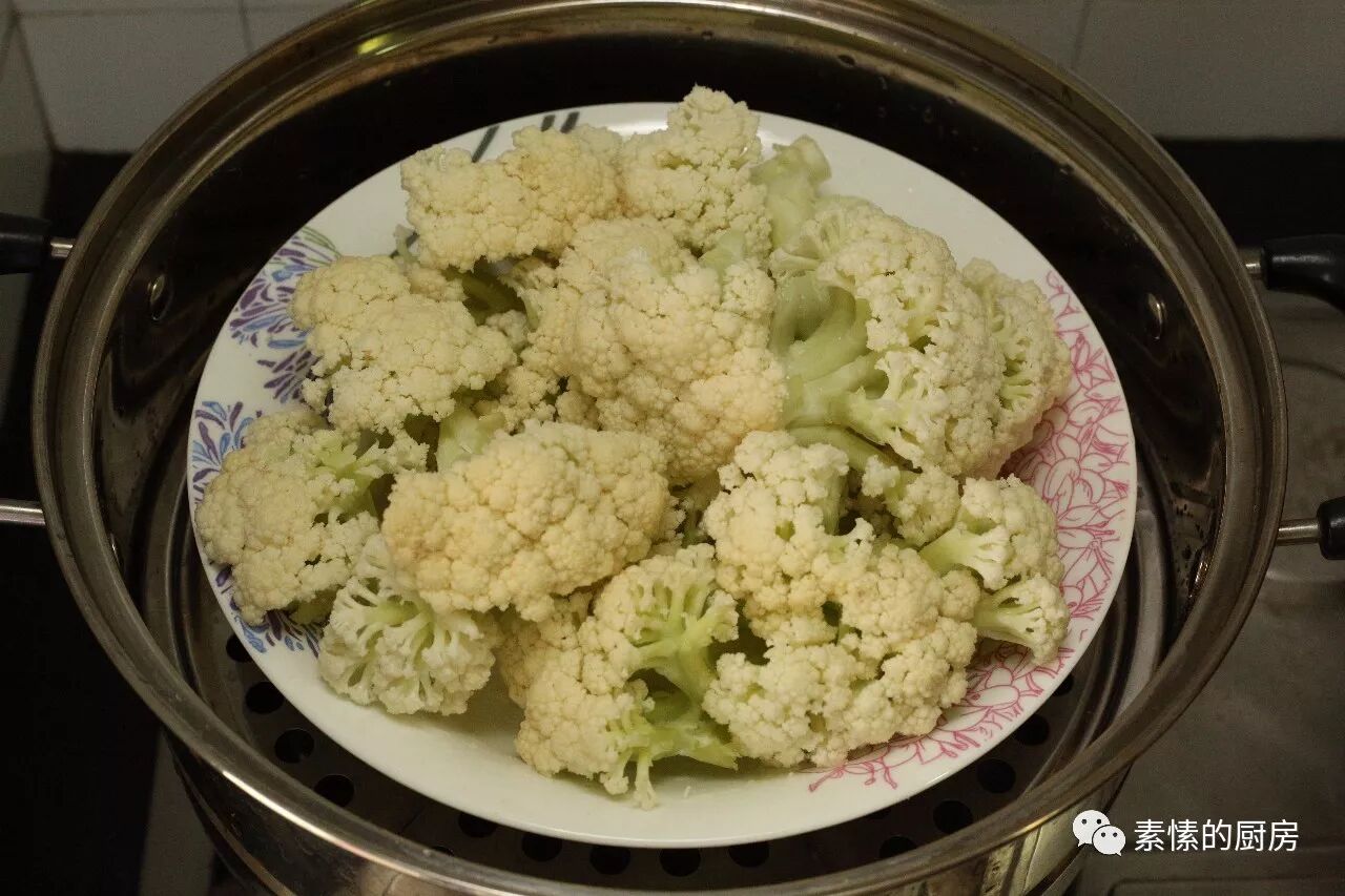 1. 花菜切成小块,水烧开后放入蒸,约3分钟即熟,不要蒸得过于软烂,呆会下锅全散架了。