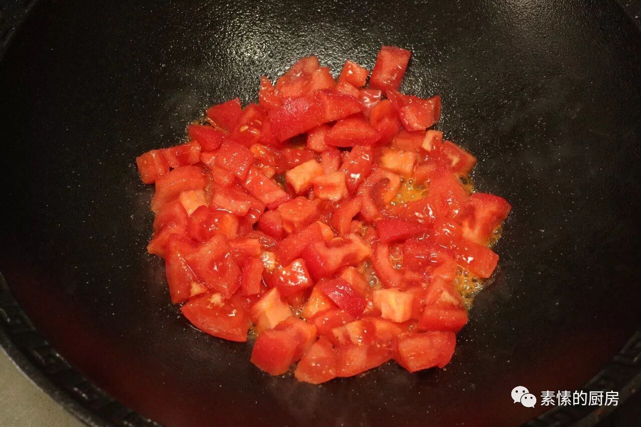 2.番茄去皮切小块,锅里放少许油烧热,倒入番茄炒,加少许盐(有利更快出汁)。
