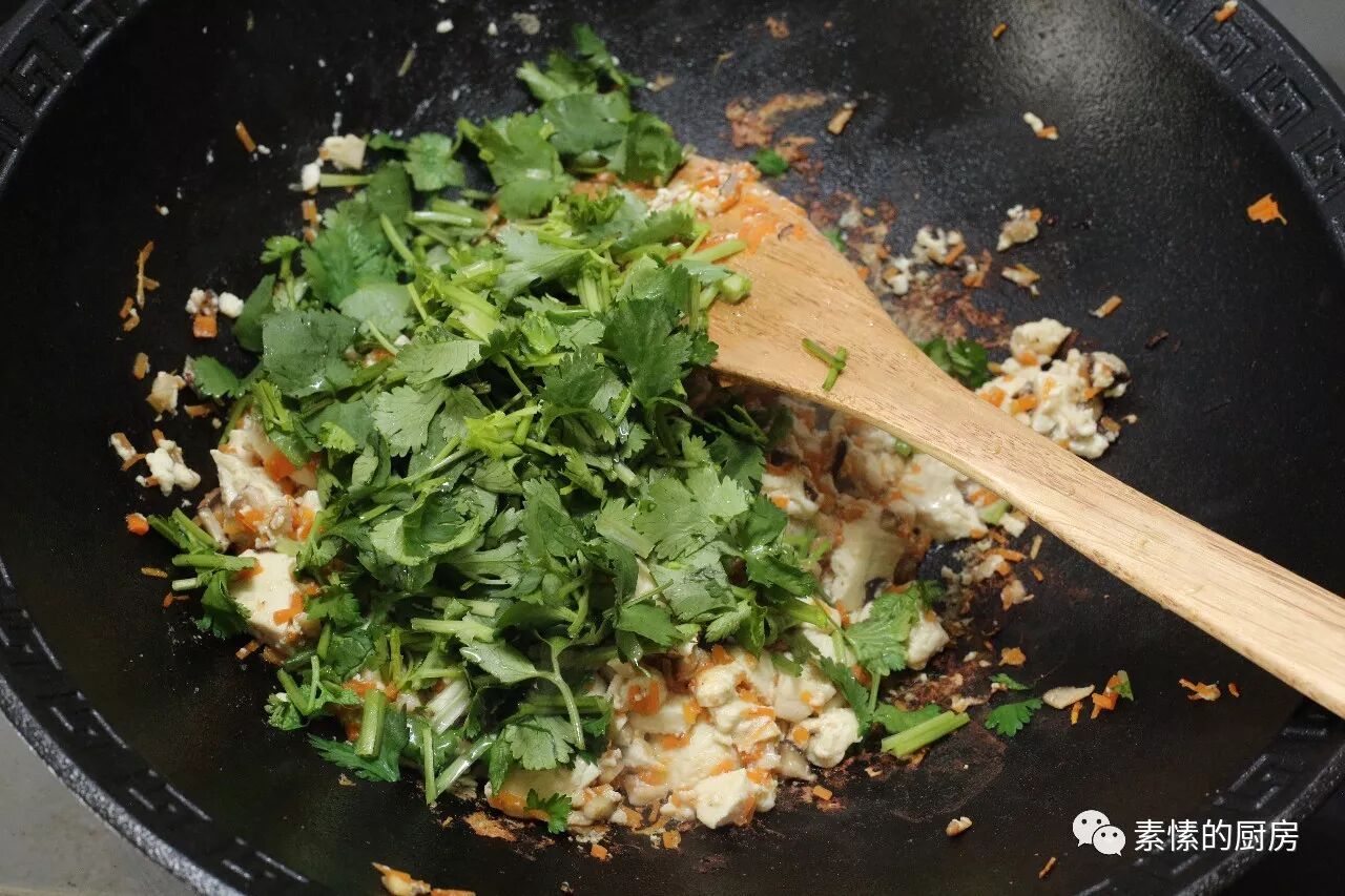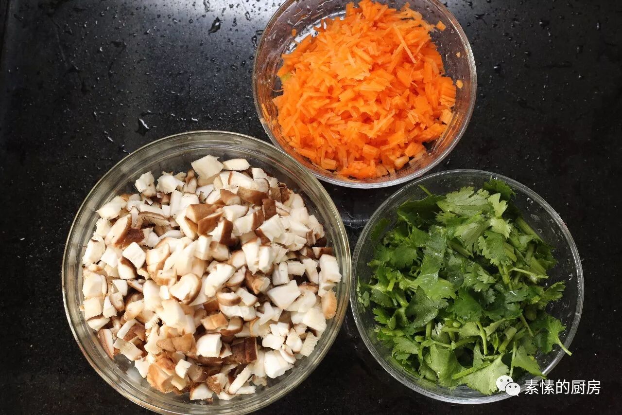 香菇切去根部黑色,切成小粒。香菜去根切碎。