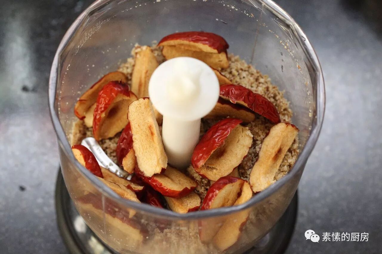 3. 加入去核的红枣一起磨碎。(机器够强的话,2,3步一起做也可以)。