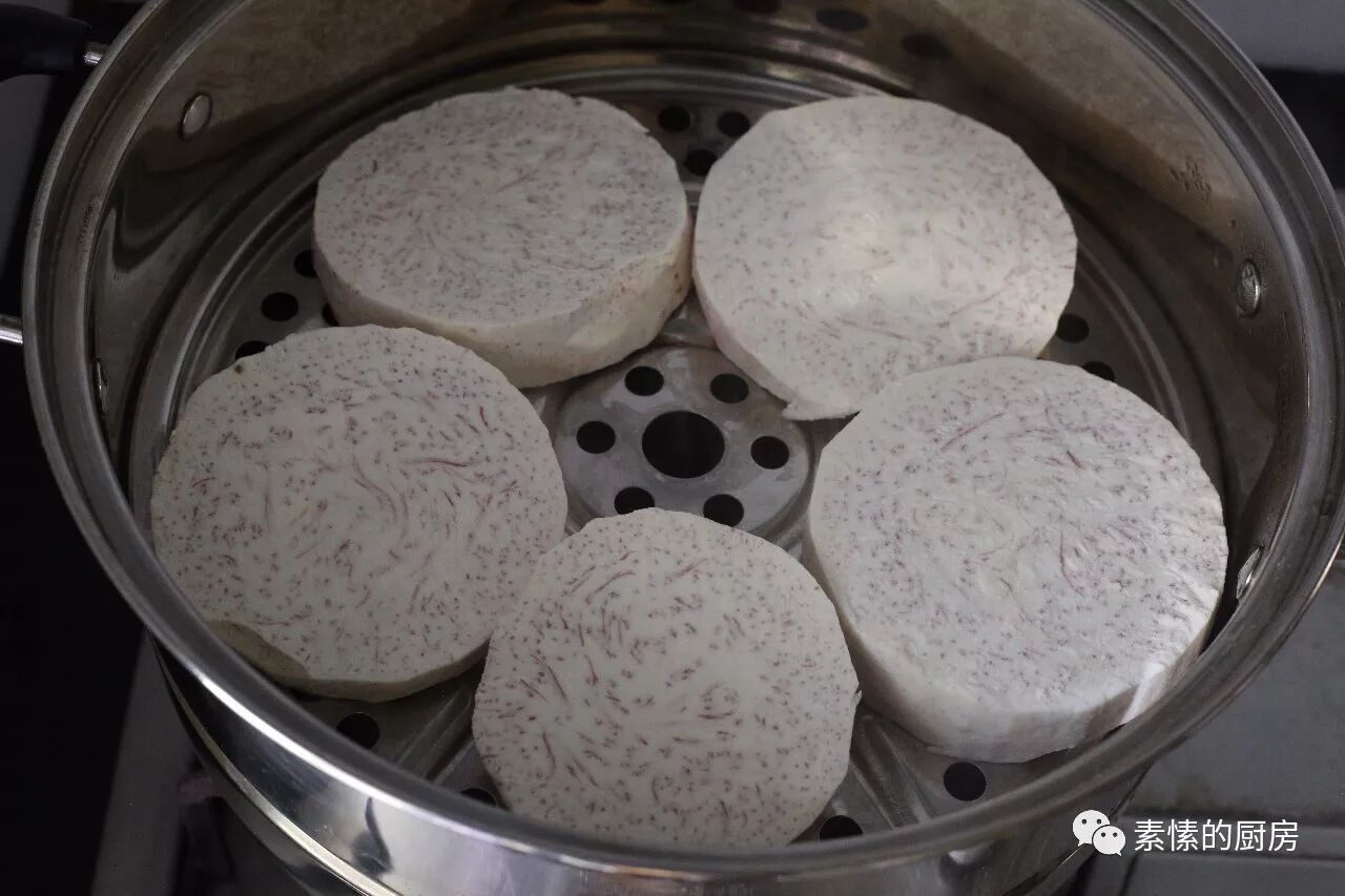 1. 芋头去皮,切成约一厘米厚的圆片,直接放在蒸格上,蒸熟。