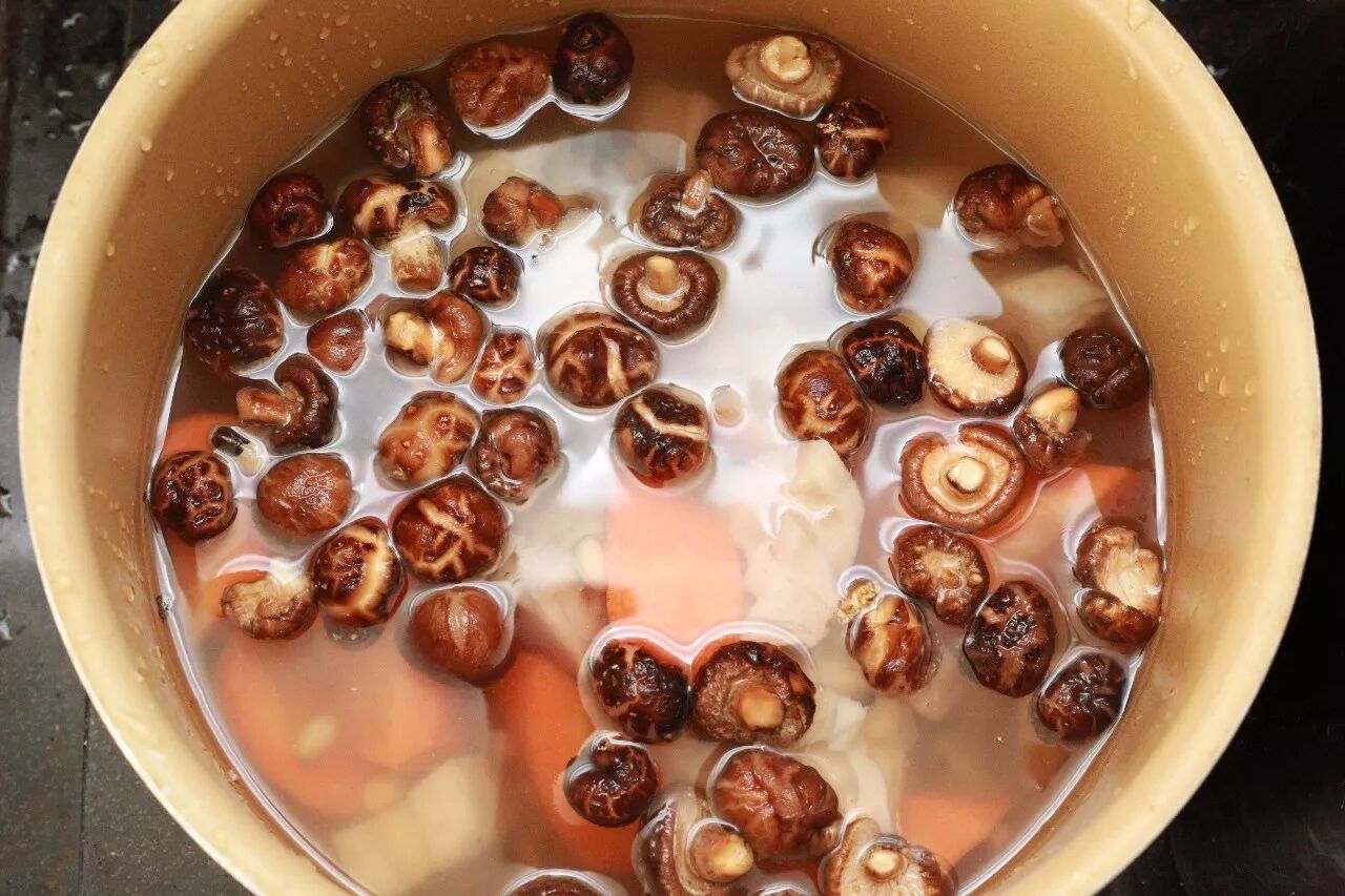 5. 所有材料,加泡菇的水,放进压力饭锅,或其他适合的锅。