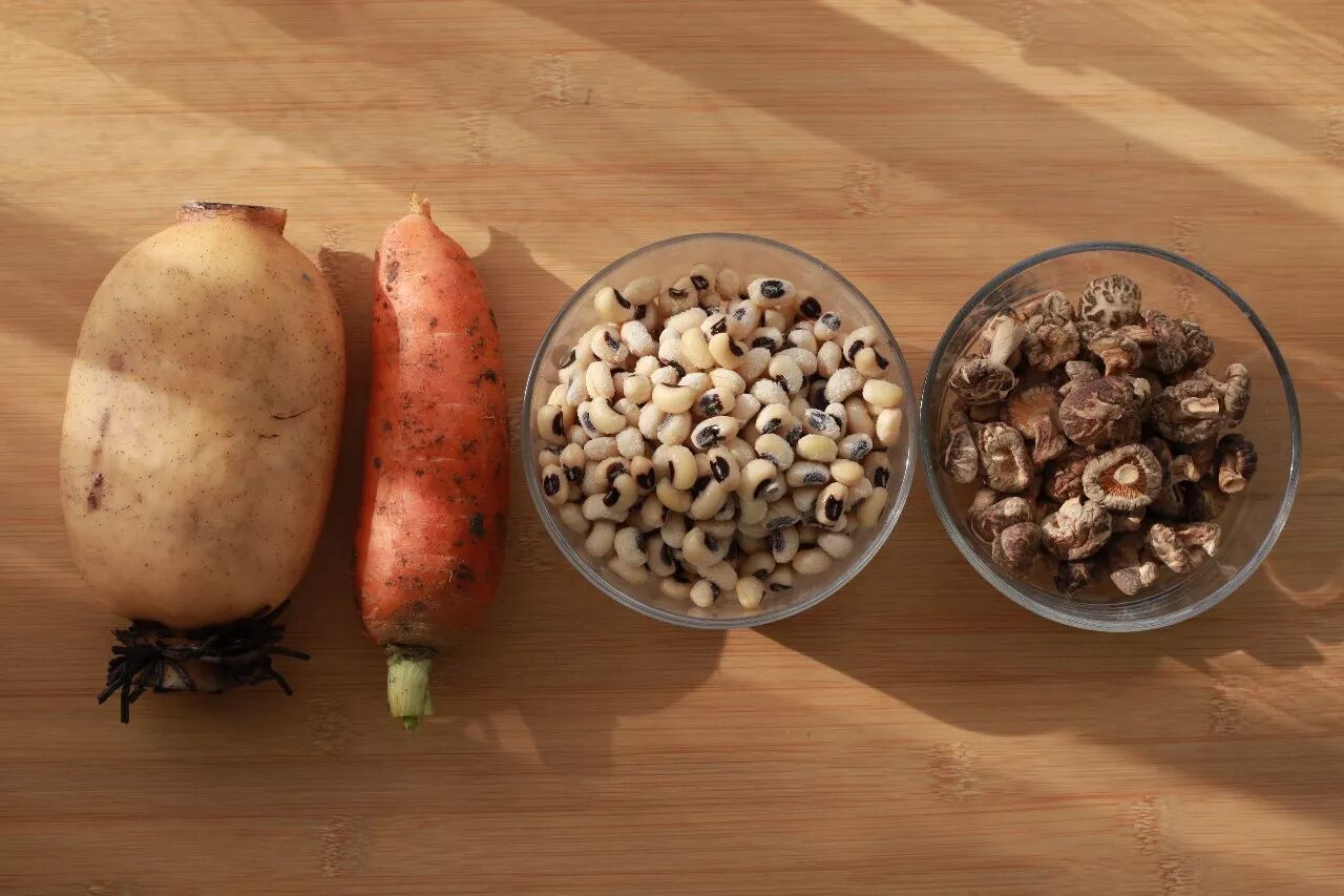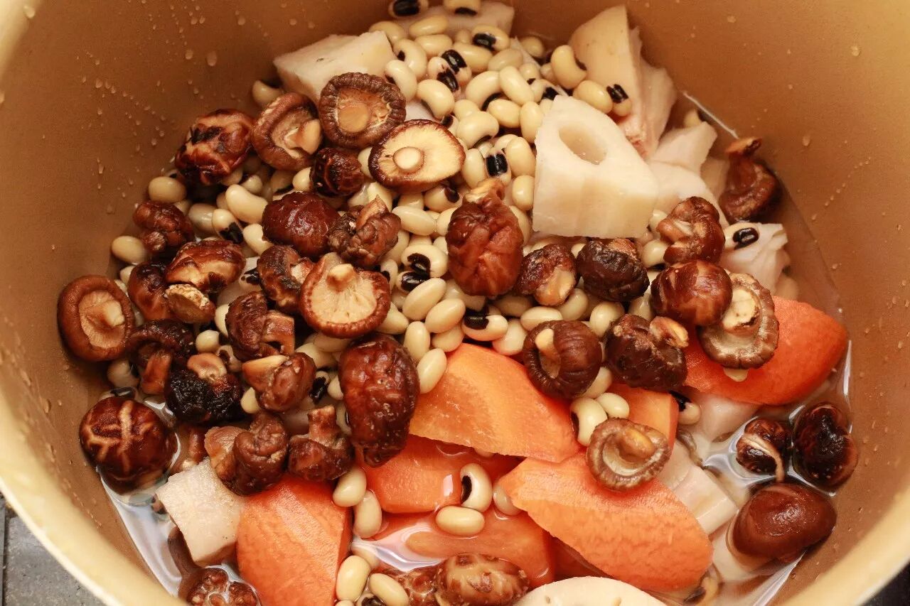 【主角】:莲藕,胡萝卜,眉豆,干小花菇。