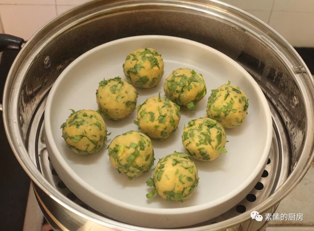 3.用手抓一把菜豆泥,用力捏匀,团成球,如食材太干,手心湿点水可能有利于成形。于开水锅上蒸七八分钟即可。