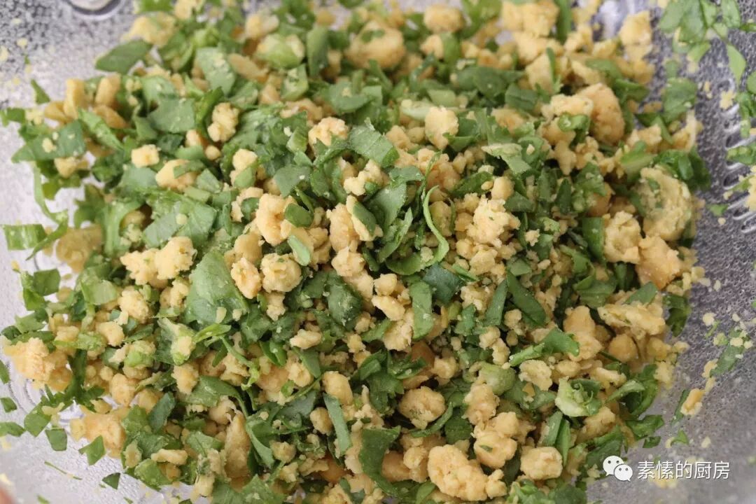 2.茼蒿菜洗净切碎,尽量用叶子部分,切得细碎整齐。不喜欢茼蒿味道的可以试下用其他菜,比如雪菜叶子。与豆泥拌匀。