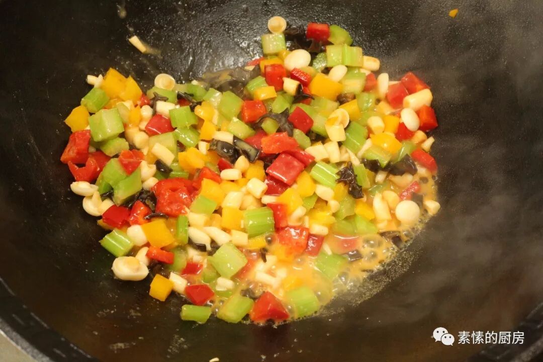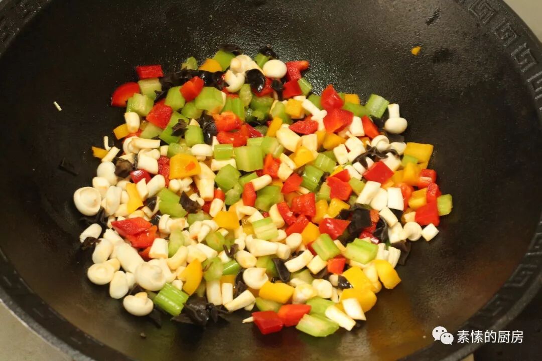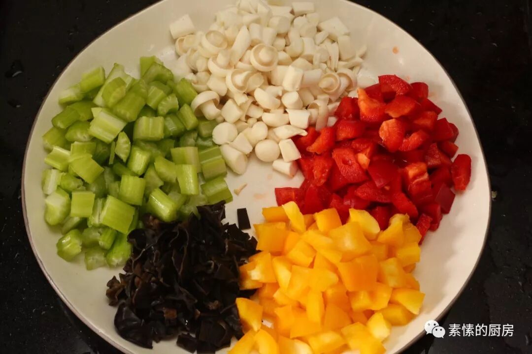 3.红黄甜椒各半个,西芹1-2根,白玉菇一把,黑木耳数朵,全切成小粒。