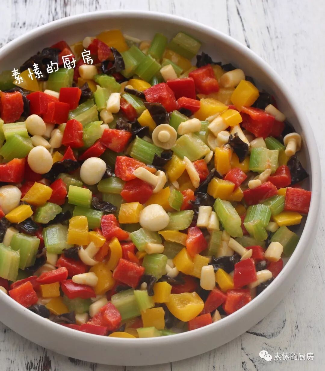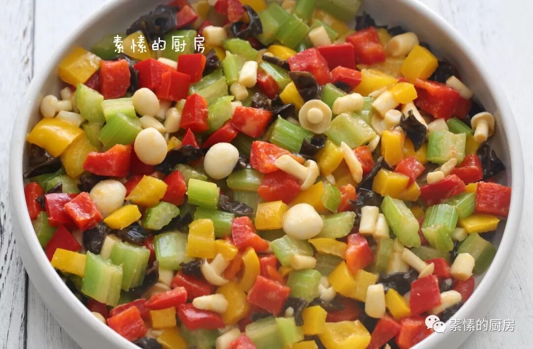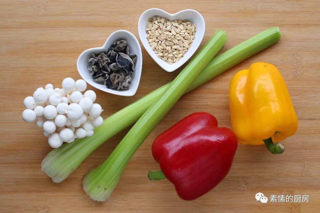 【主角】:5色鲜蔬:西芹,红甜椒,黄甜椒,白玉菇,黑木耳。