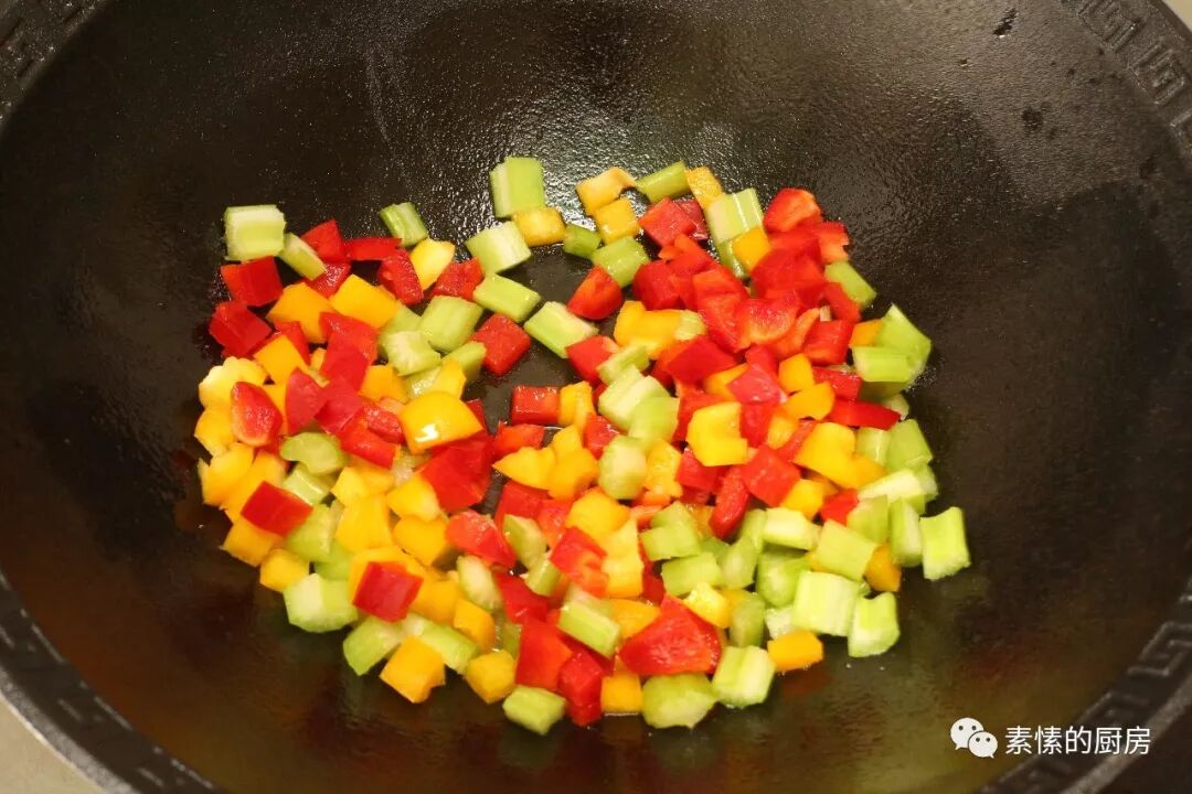 4. 滴入少许油在锅烧热,倒入西芹,红黄椒,翻炒一小会,加少量盐。