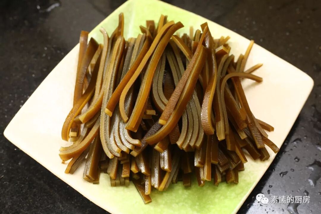 1.蒸软泡好的海带切成整齐的细丝儿。
