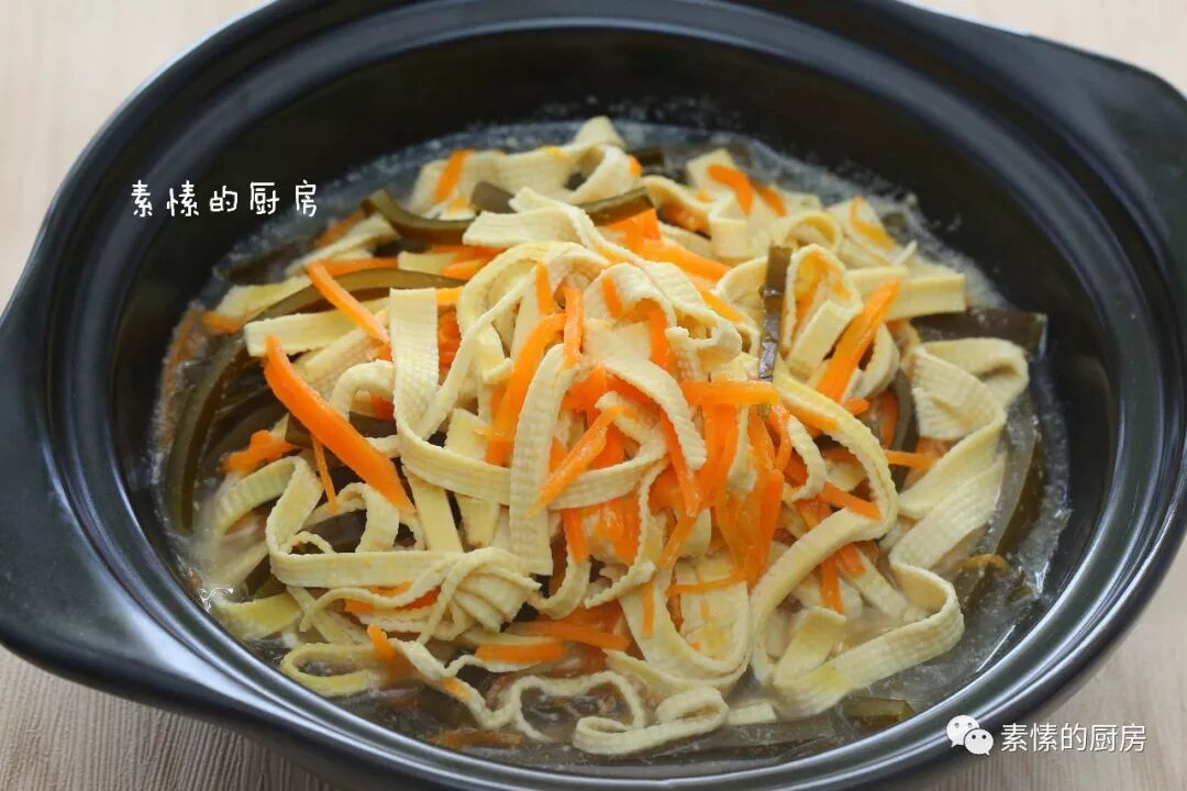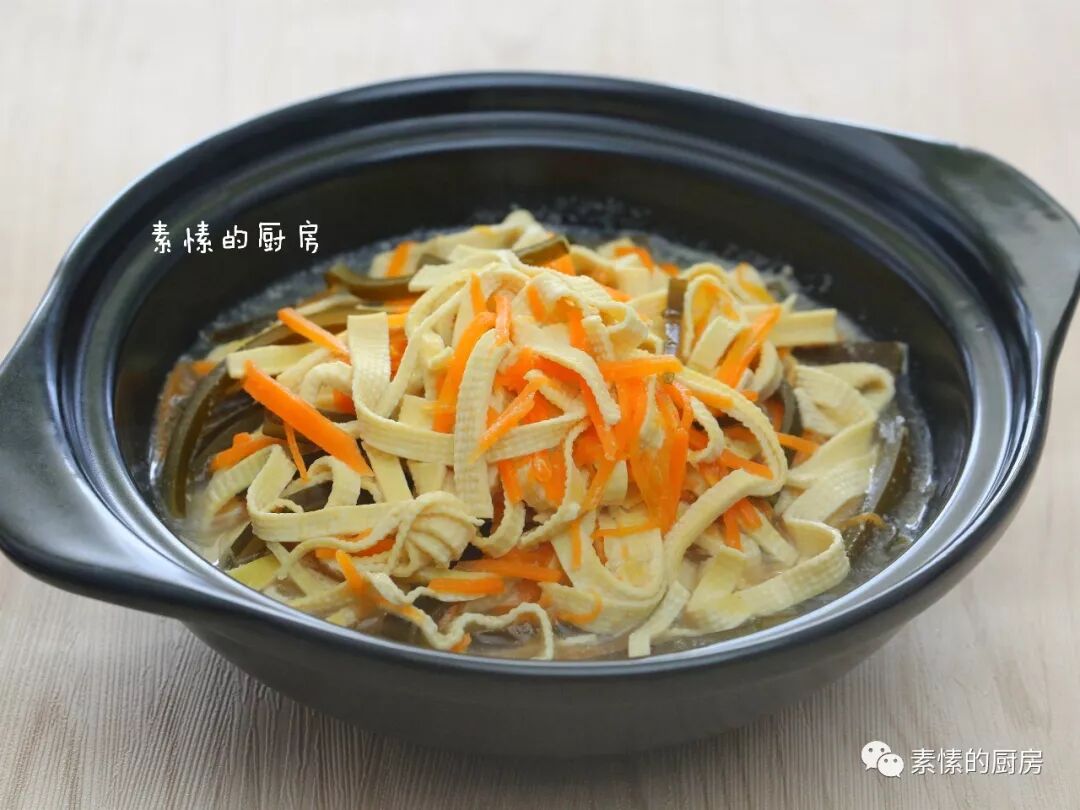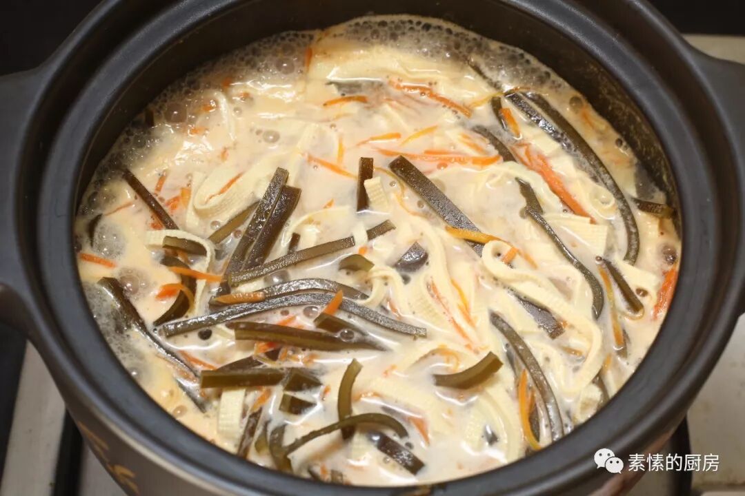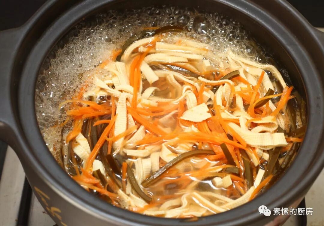 4.泡海带的水(很重要,鲜味全在这儿!)与海带丝入锅,煮开后,加入胡萝卜和千张一起煮,如水不够适量添加好水,依个人需要加适量盐。