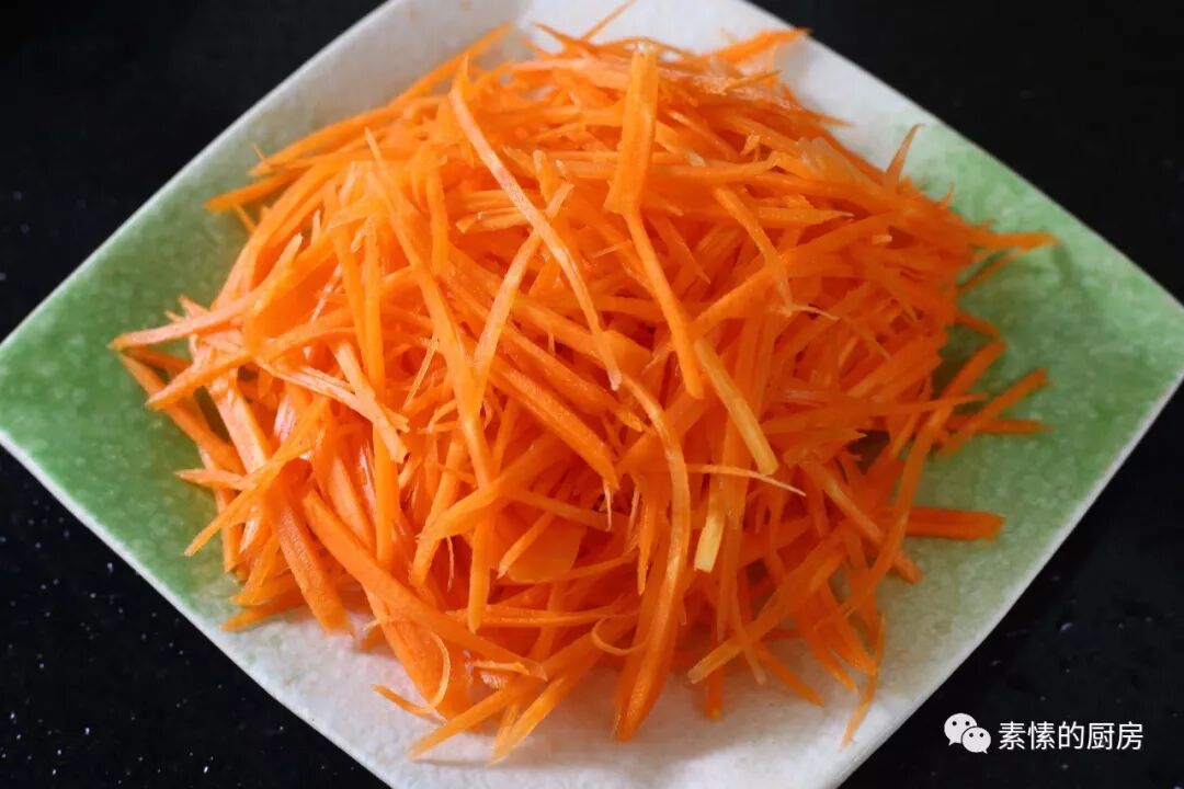 2.胡萝卜去皮,用擦丝器弄成细长的丝儿。