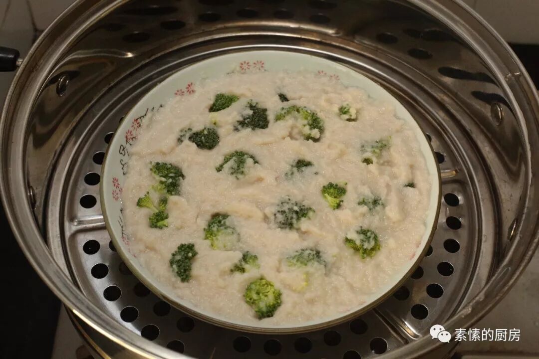 5.把菜种进雪地,稍用些糊盖在菜花上,使之若隐若现。水烧开后,放锅里蒸熟,大约八九十来分钟。