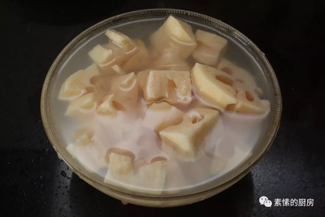 2.大碗装半碗水,莲藕去皮,一边切块一边放入水中。用水洗礼过,一会打浆不会变色,蒸出来就会有雪地的感觉,不然颜色会略暗,但味道无多差别。
