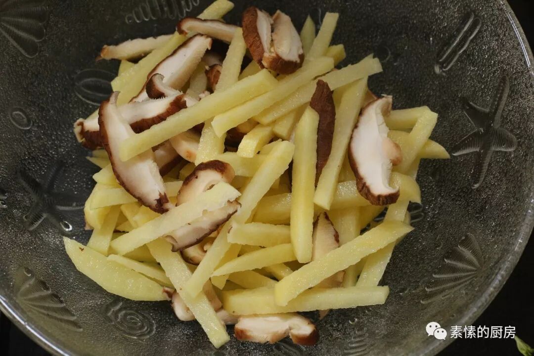 1.香菇切去脚部黑色部分,切成片。土豆去皮切成细条,不用太细,跟薯条那样就可以了。撒少许盐,将两种食材拌匀。