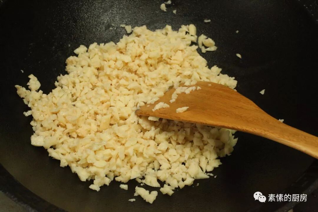 5.锅烧热,滴少许油(锅不粘的话,油可省),倒入藕碎,加适量盐炒熟,约一分钟。
