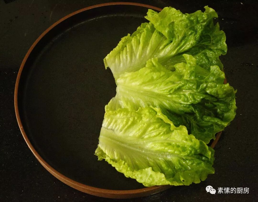1.生菜洗净准备生吃。可以用环保酵素浸泡45分钟,再用流动的水每片认真冲洗。摆一些菜在盘中,其余备用。