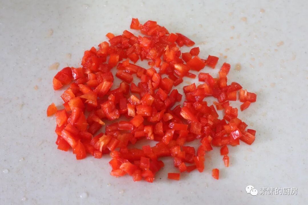 6.加入红椒炒匀,倒入糖浆翻匀。如果稠度合适即关火,如果太稀则小火收干。