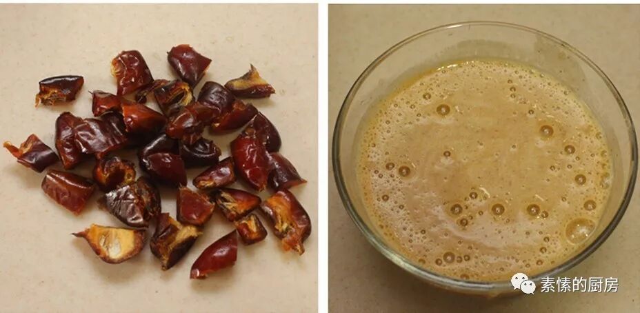 3.椰枣去核稍切小。一节中等大的藕大约用五六颗枣,加适量的好水(过滤可直接喝的)放进搅拌机,打成浓糖浆。